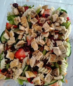 Base de lechuga, 130 g de pollo a la plancha, pimiento morrón, fresa, nuez y arándano. Incluye crotones y 1 aderezo ranch más otro a elegir.