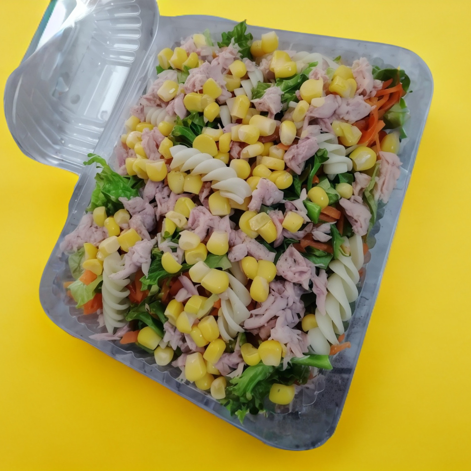 Base: lechuga más zanahoria rallada, elote, brócoli cocido, pasta, proteína: atún 1 lata drenada (90 g).