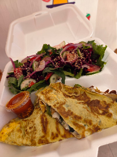 2 Huevos, queso gouda, champiñones, espinaca y pimientos. Acompañamiento: ensalada cubierta de vinagreta de fresa o mostaza miel más macha, ranch o chipotle.