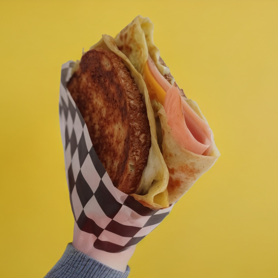 2 Huevos batidos más 2 rebanadas de jamón de pavo, queso gouda, queso americano. Pan a la mantequilla en sartén. Acompañado de ranch y tipo chipotle.