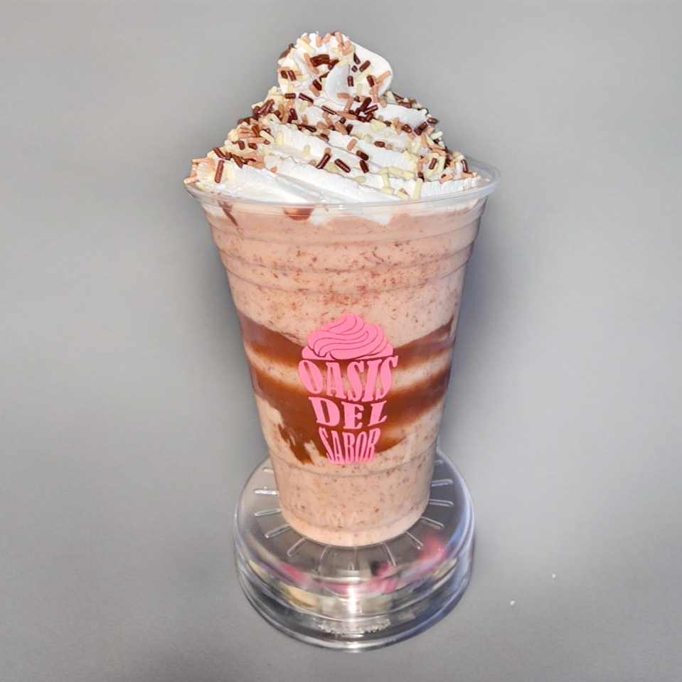 Vaso de 12oz cubierto de crema de avellanas, con fresa natural combinado con una cremosa mezcla de la casa y toppings de tu elección
