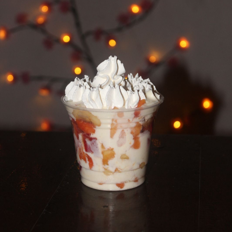 Vaso de 10oz con fruta de tu elección picada combinada en una cremosa mezcla a base de yoghurt natural y endulzantes coronada con crema batida sabor nata y toppings de tu elección.