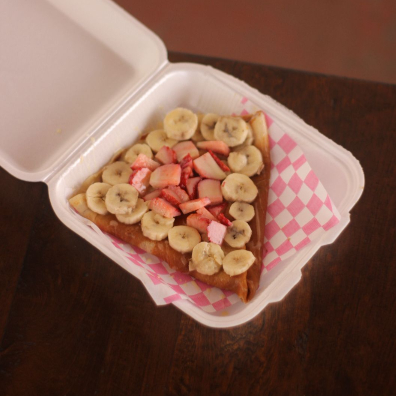 Nieves de tu elección, plátano, crema batida y topping a elegir.