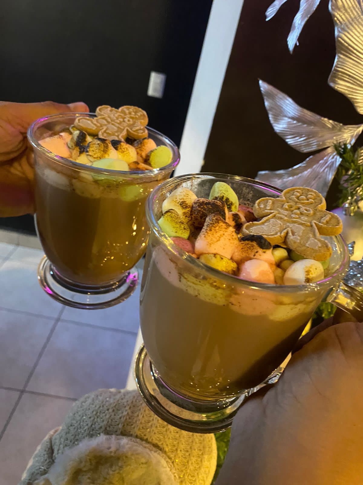DELICIOSO CHOCOLATE CON CACAO, CORONADO CON MALVAVISCOS FLAMEADOS Y GALLETITA EXTRA.