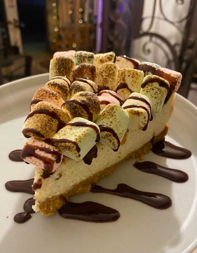 CHEESECAKE CON MALVABISCOS FLAMEADOS Y RAYADO CON CHOCOLATE