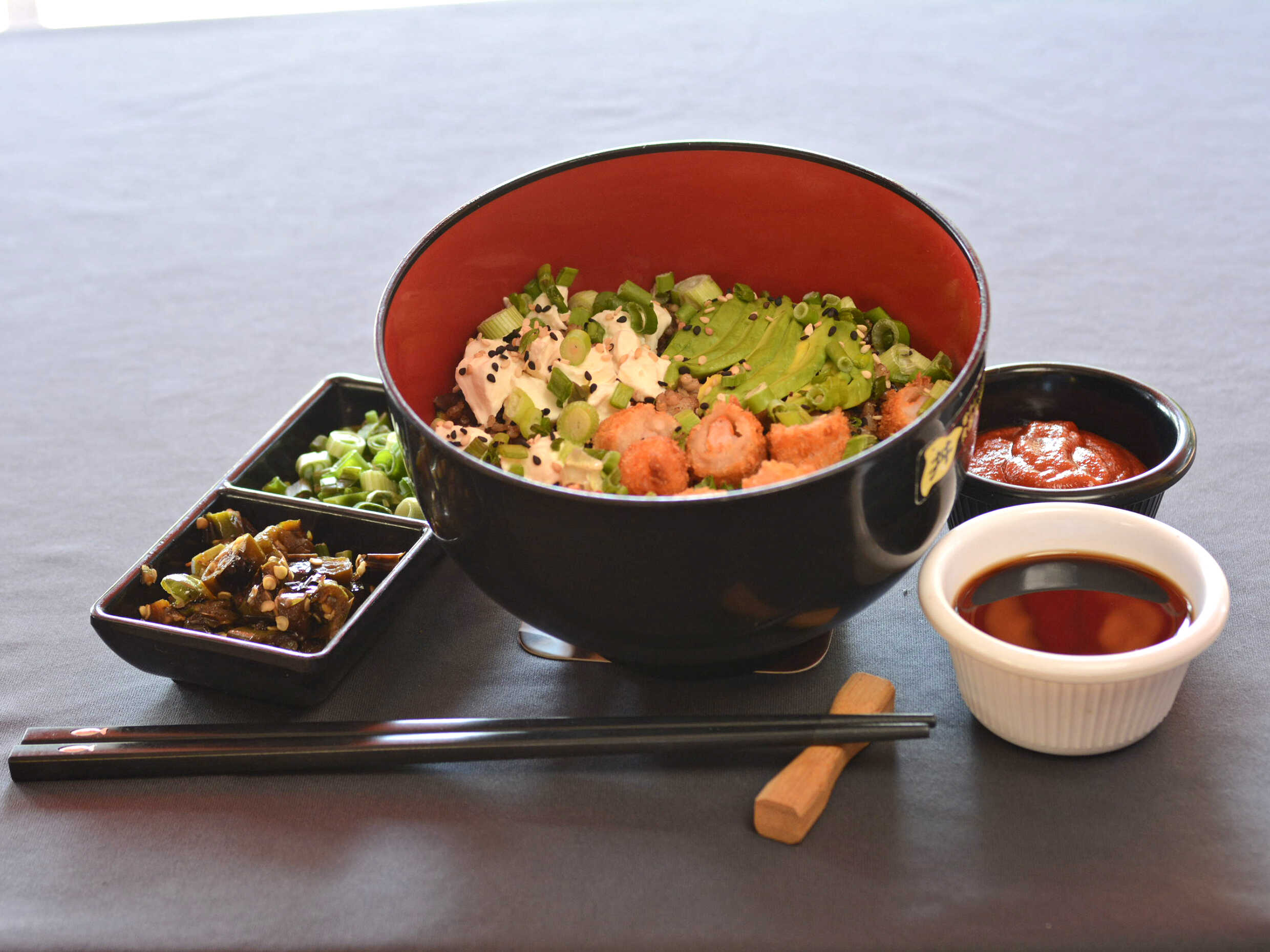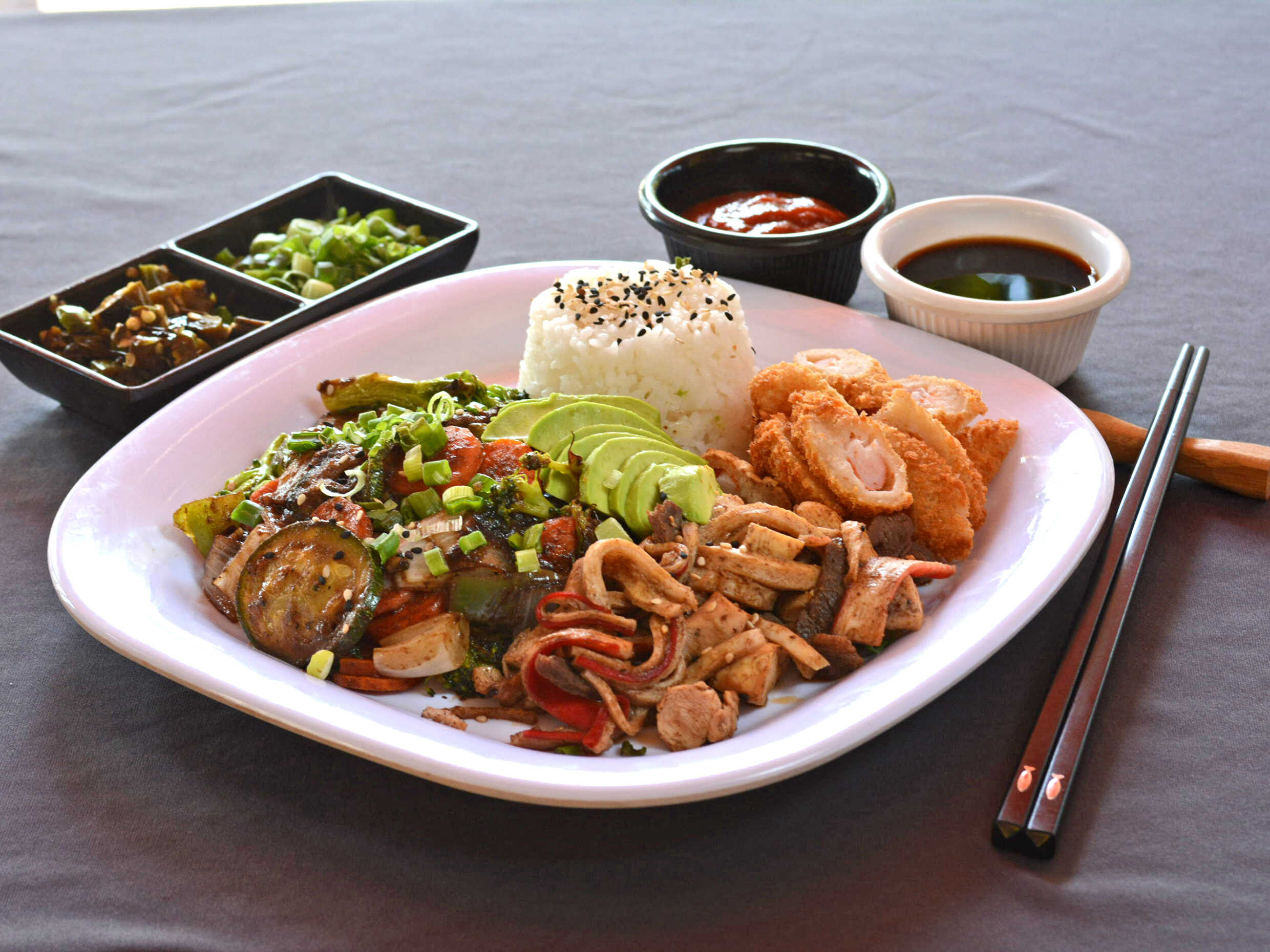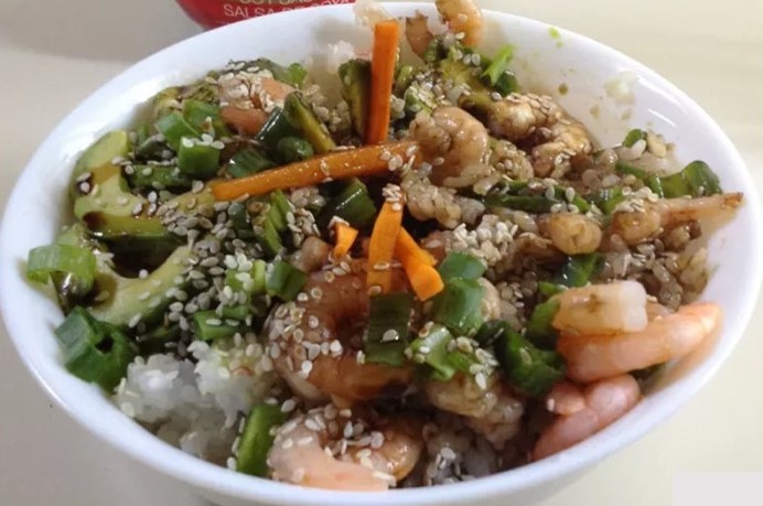 Arroz frito, brócoli, zanahoria, calabacín, cebolla, queso crema, aguacte, res, pollo y camarón panko.