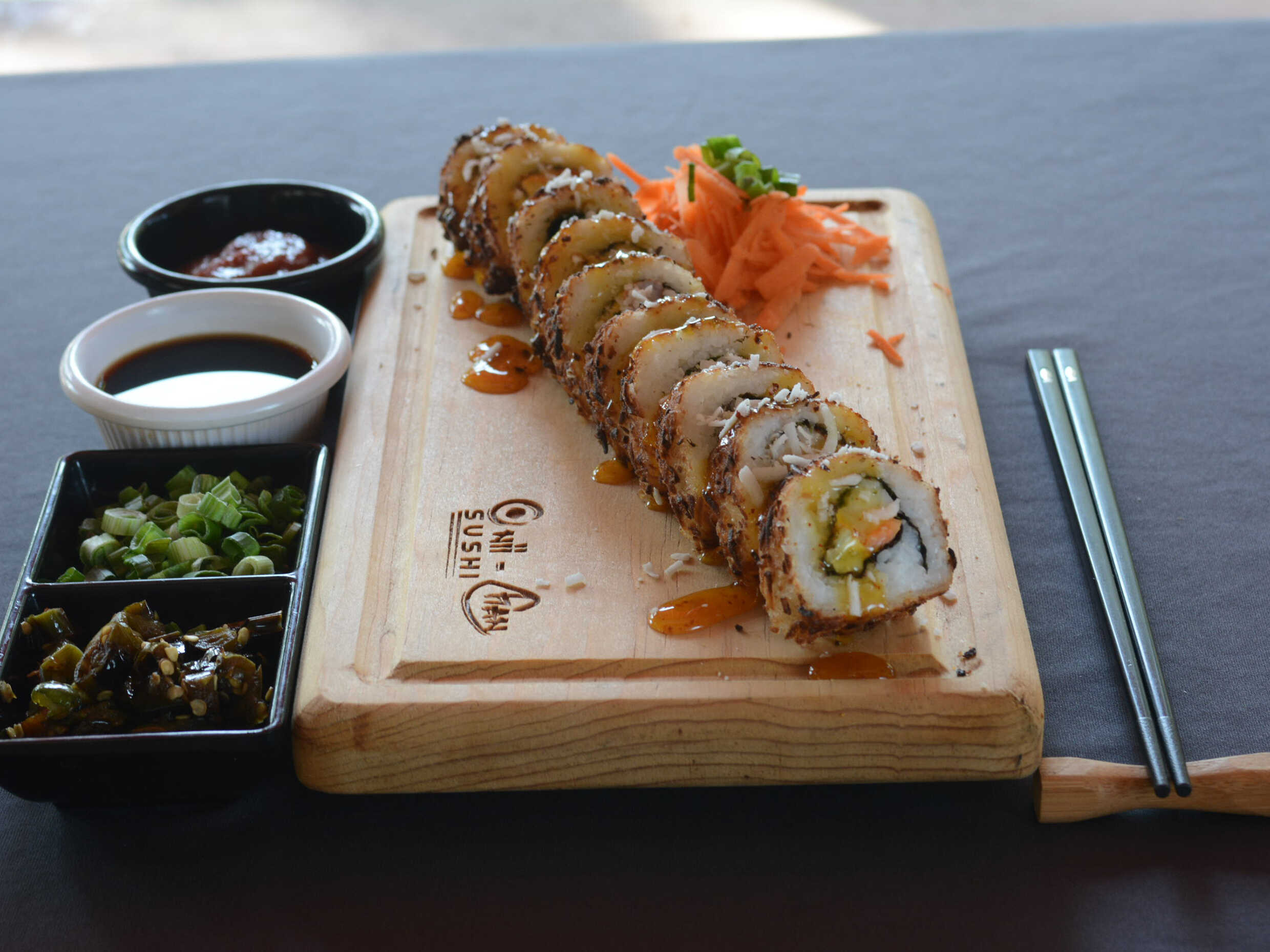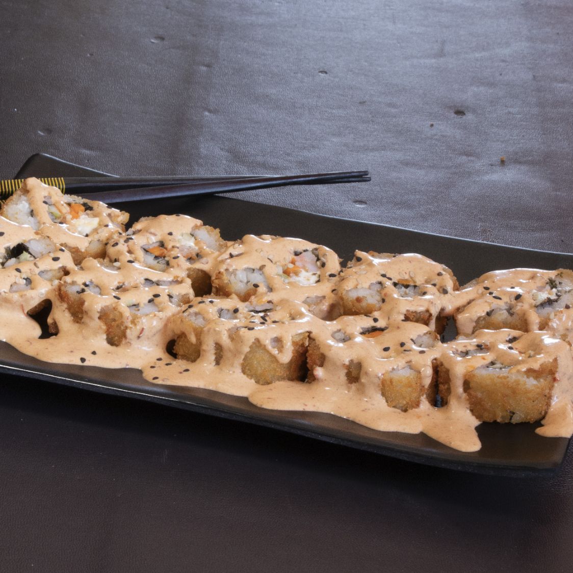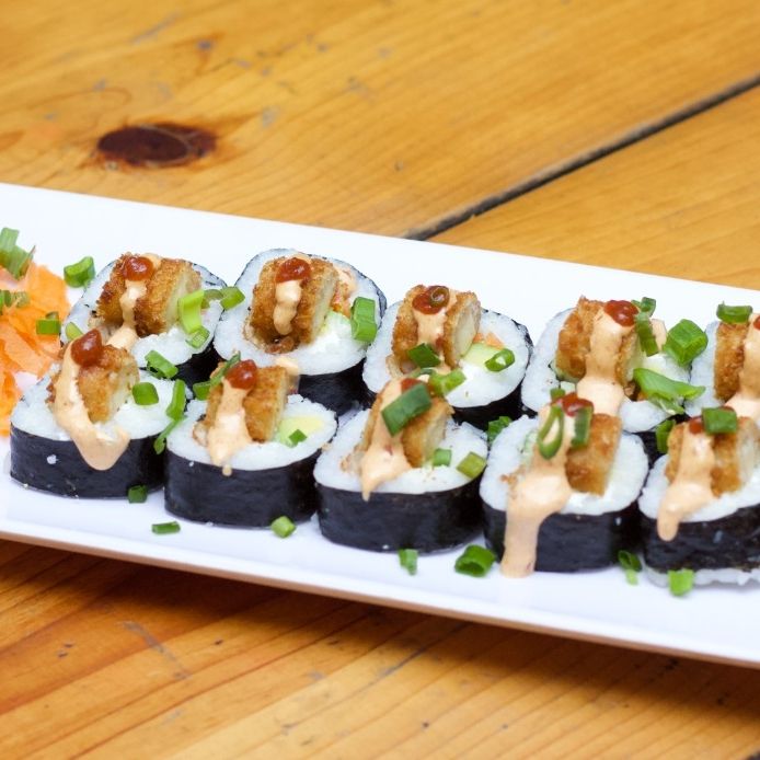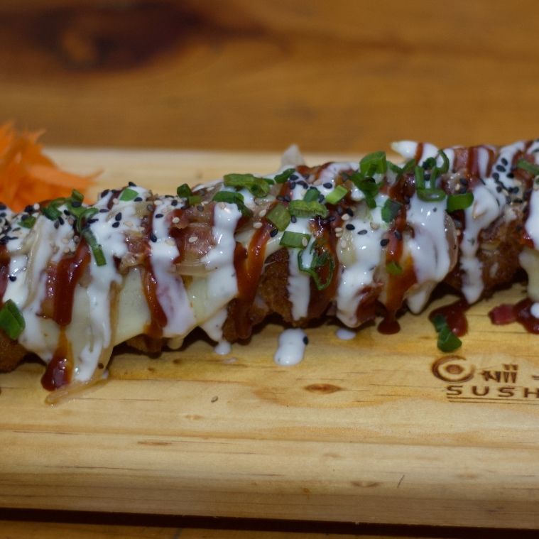 Dentro: queso crema, zanahoria, pepino. fuera: envuelto en alga coronado con pollo BBQ y bañado en aderezo ranch.
