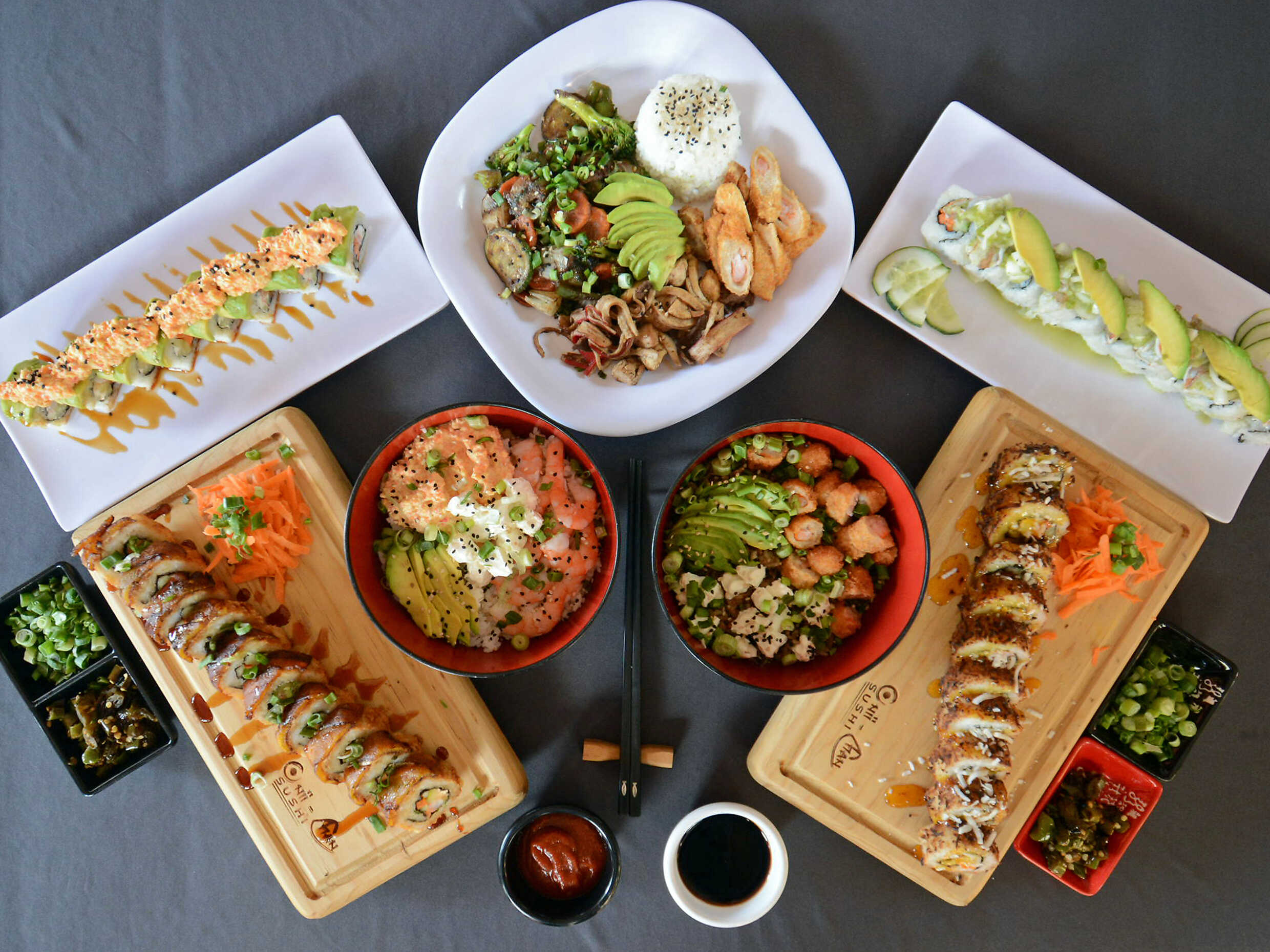 Arroz, brócoli, zanahoria, calabacín, cebolla, chile morrón, queso crema, aguacate, res, pollo y camarón panko.