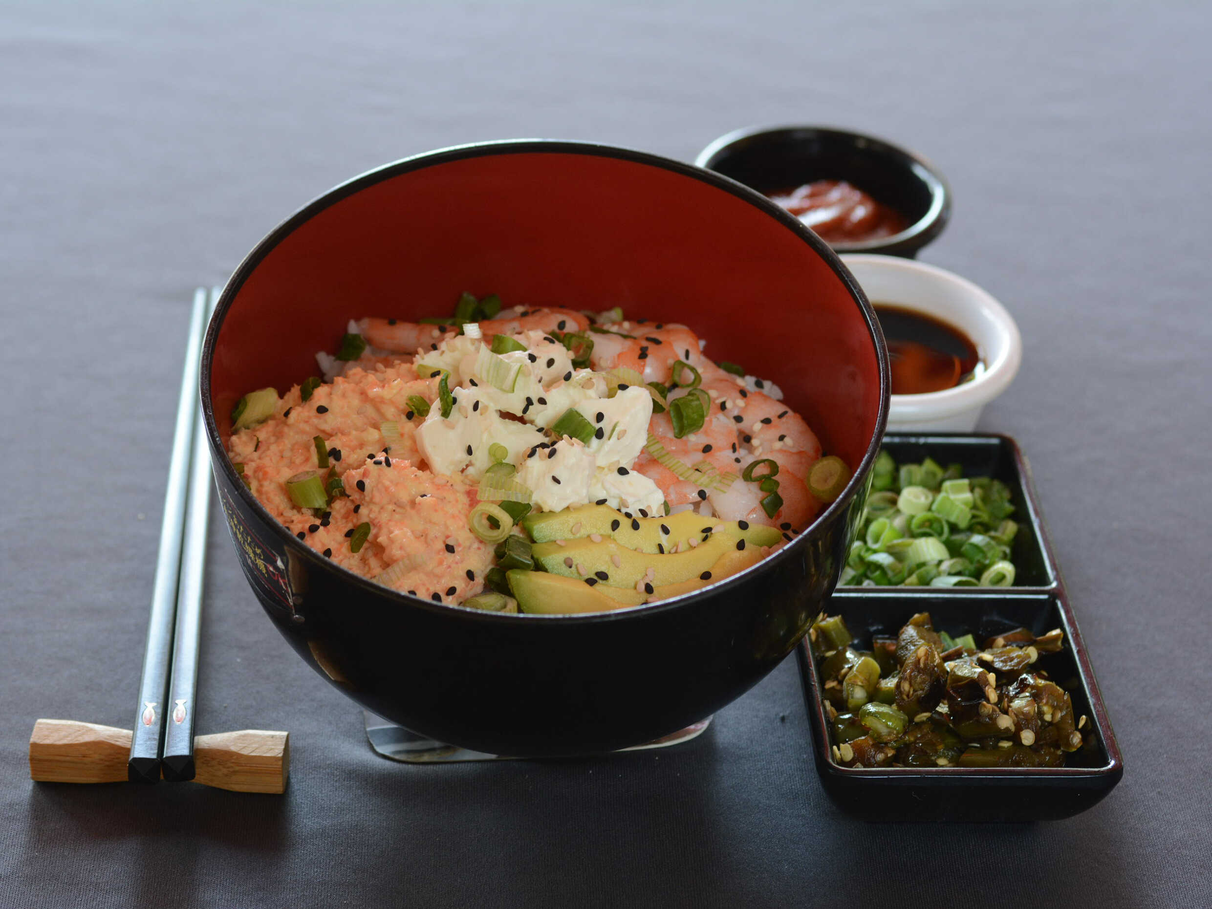 Porción personal de 490gr con Arroz frito, brócoli, zanahoria, calabacín, cebolla, queso crema, aguacate, trozos de res, pollo, camarón y surimi. Acompañados de salsa de soya y chiles.