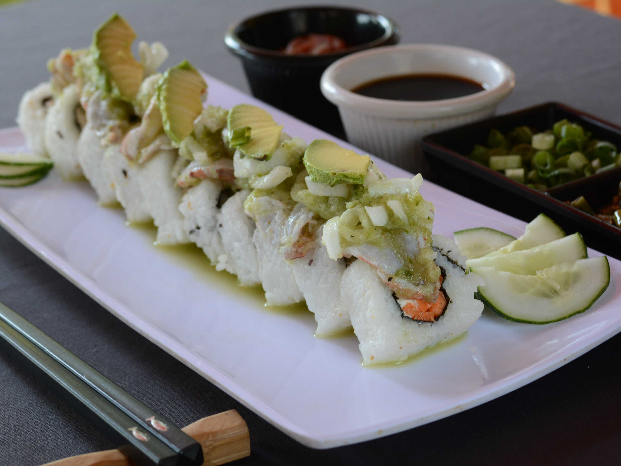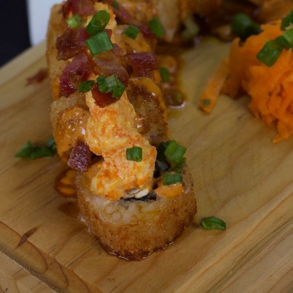 Res, queso crema, pepino por dentro, empanizado, gratinado coronado con guacamole, tocino, trozos de Serrano y sriracha.