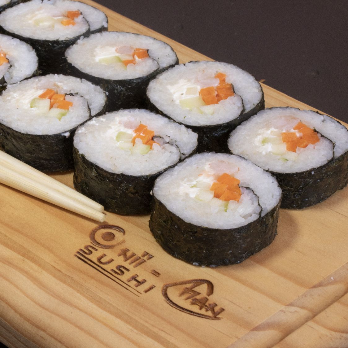 Arroz envuelto en alga, con zanahoria, pepino, queso crema e ingrediente a su elección.
