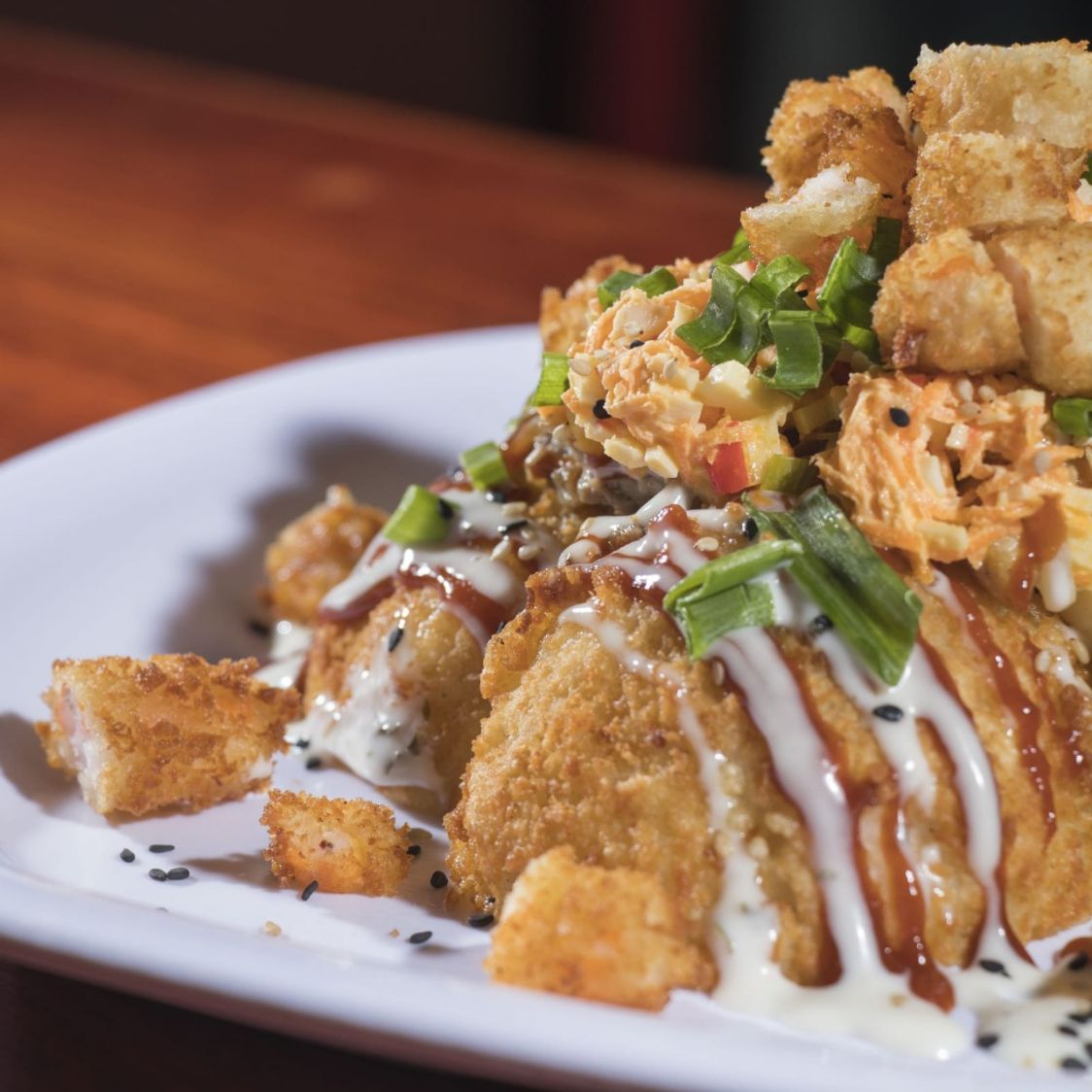 Camarón panko, queso crema, aguacate, empanizado, coronado con ensalada Tampico, trozos de tocino, bañado con aderezo chipotle y salsa de anguila