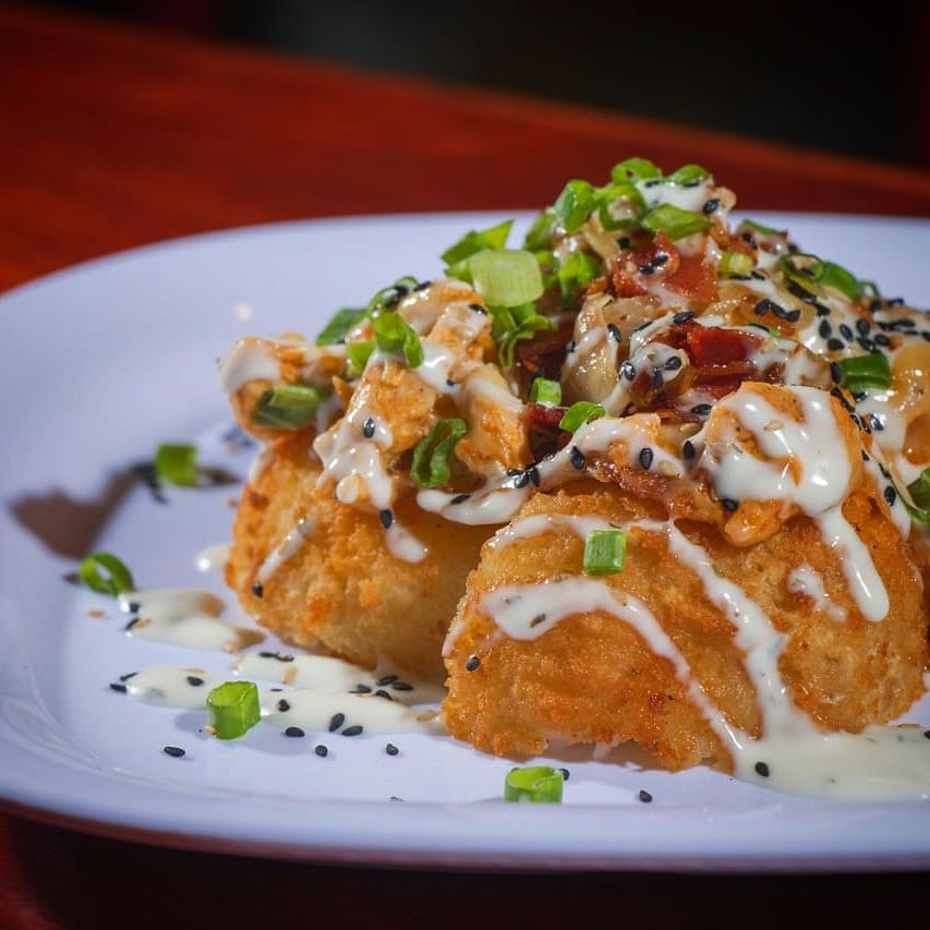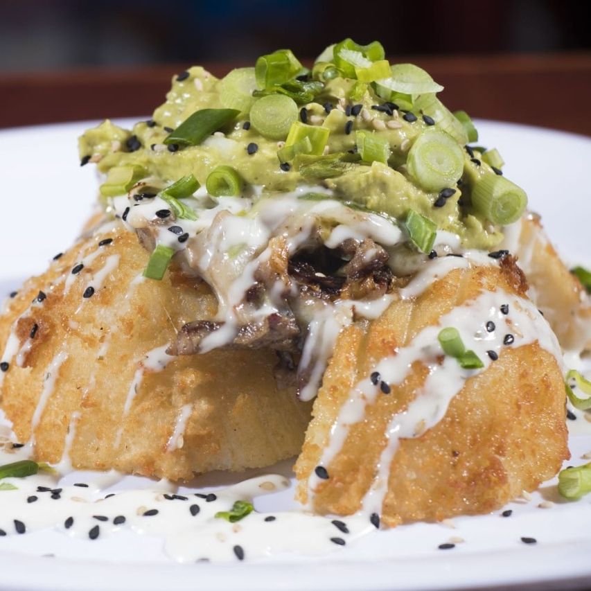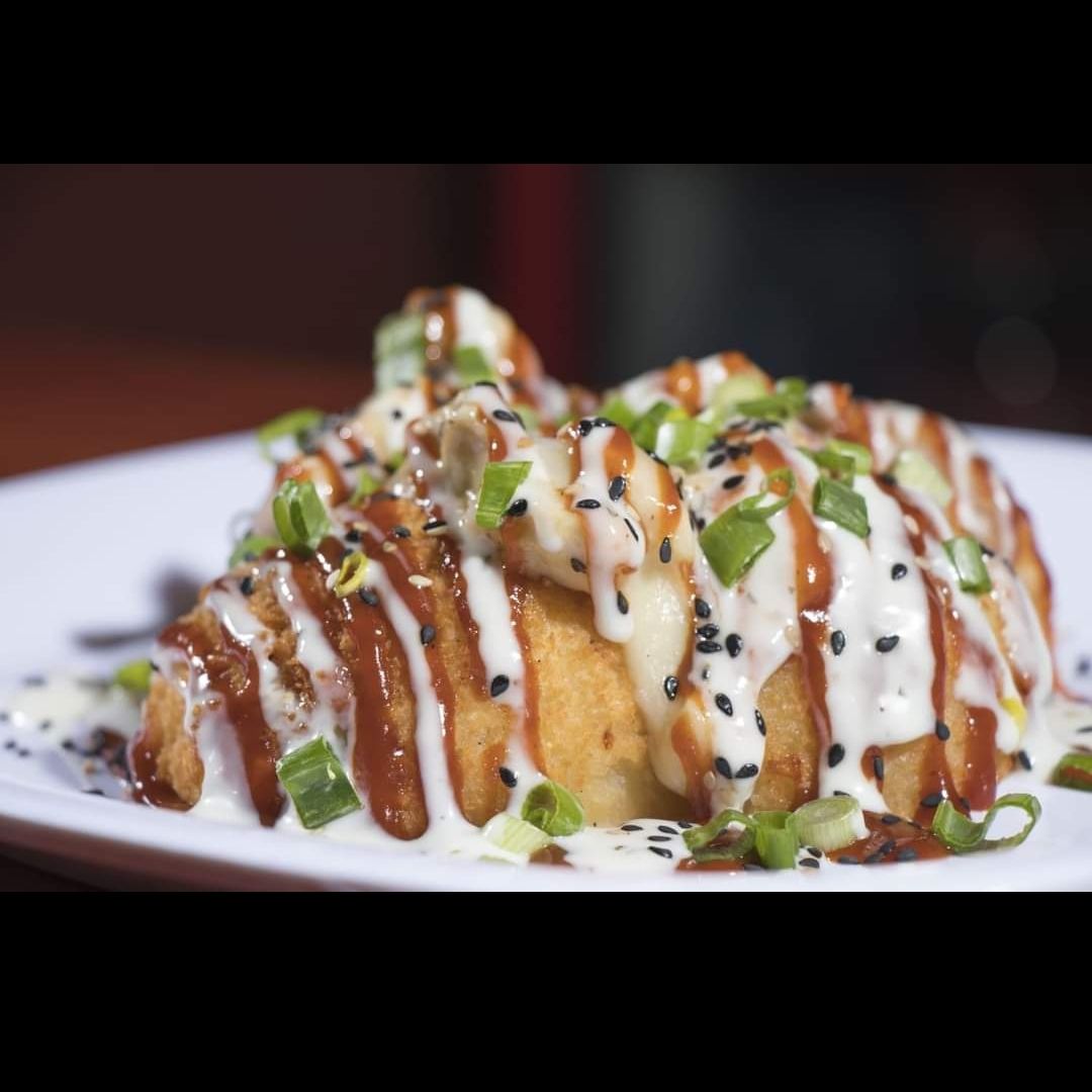 Dentro pollo, queso, crema y aguacate, fuera, tocino, cebolla dorada, queso gratinado y balado en salsa BBQ y ranch.