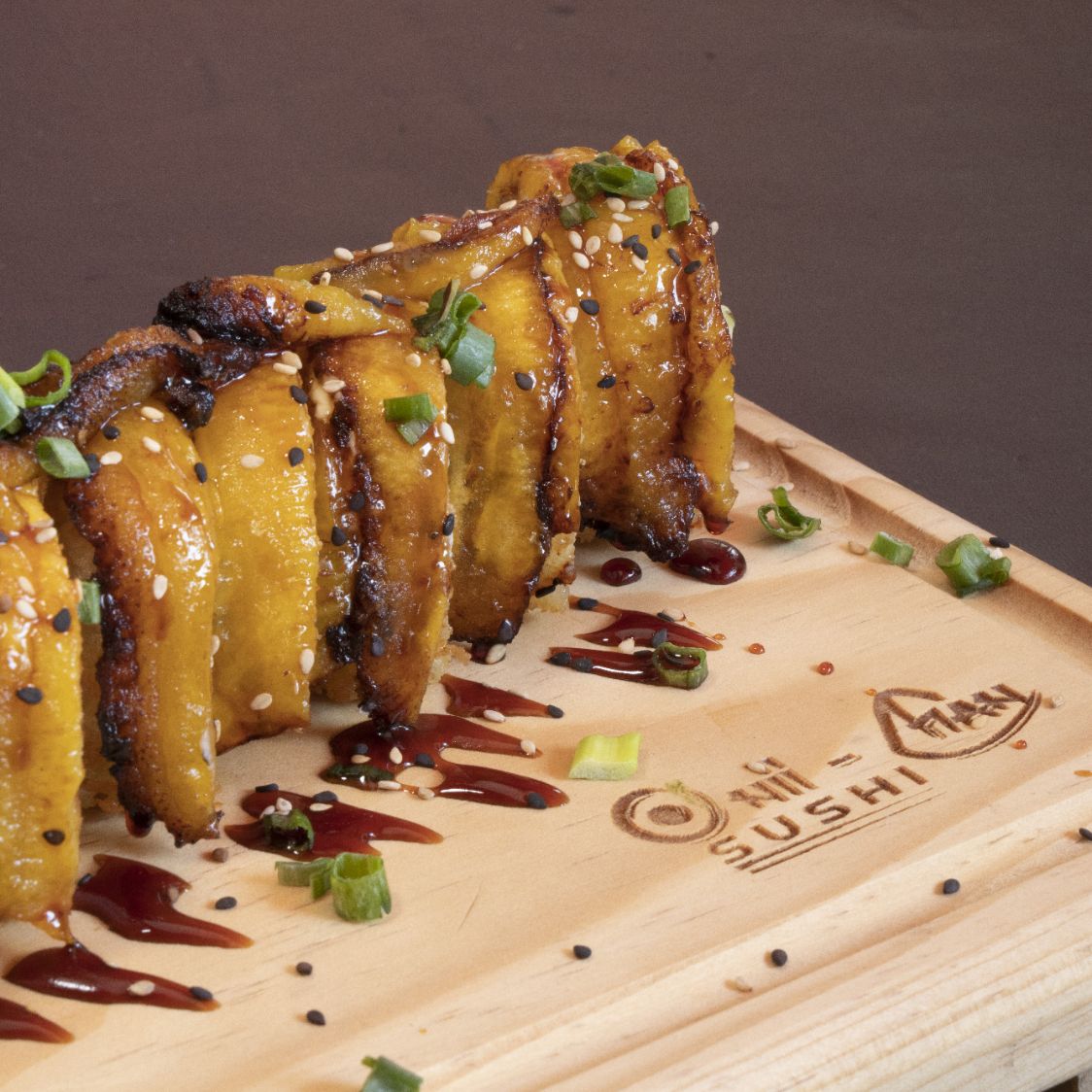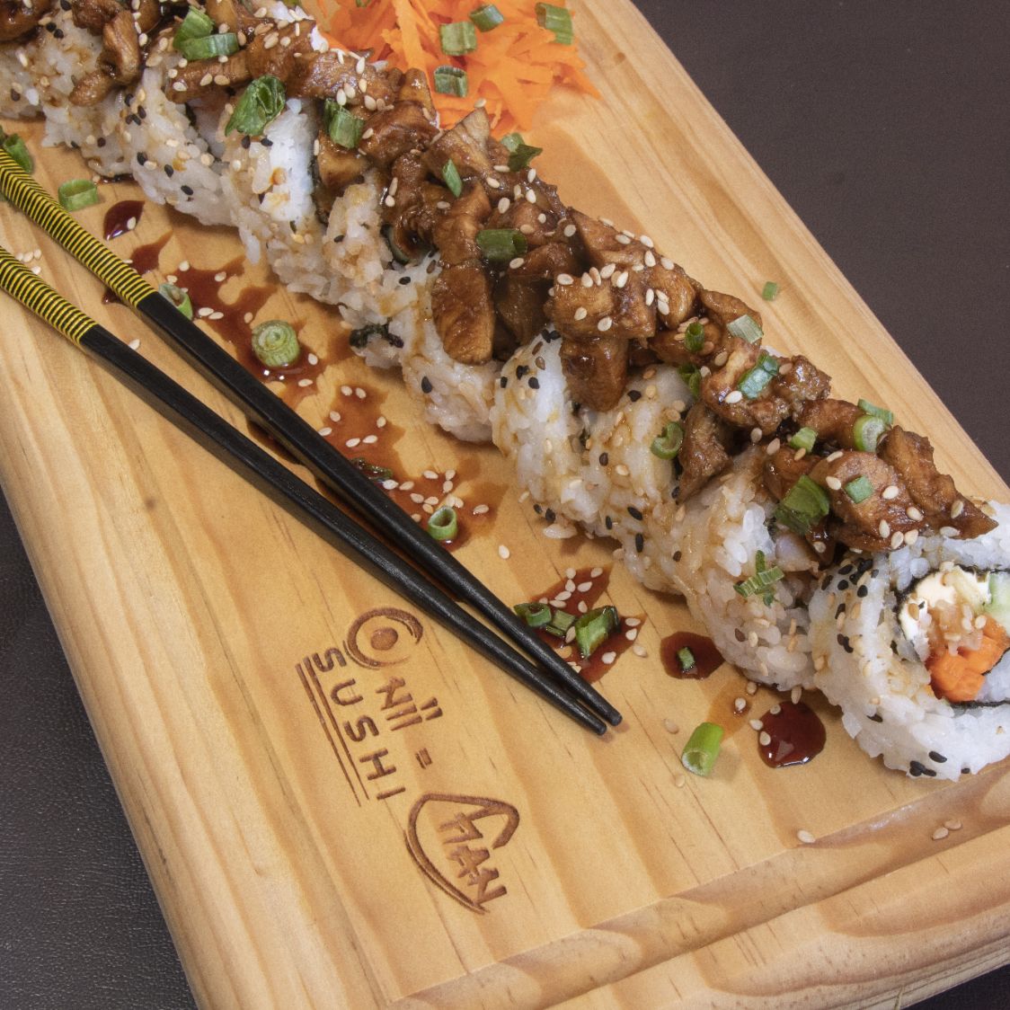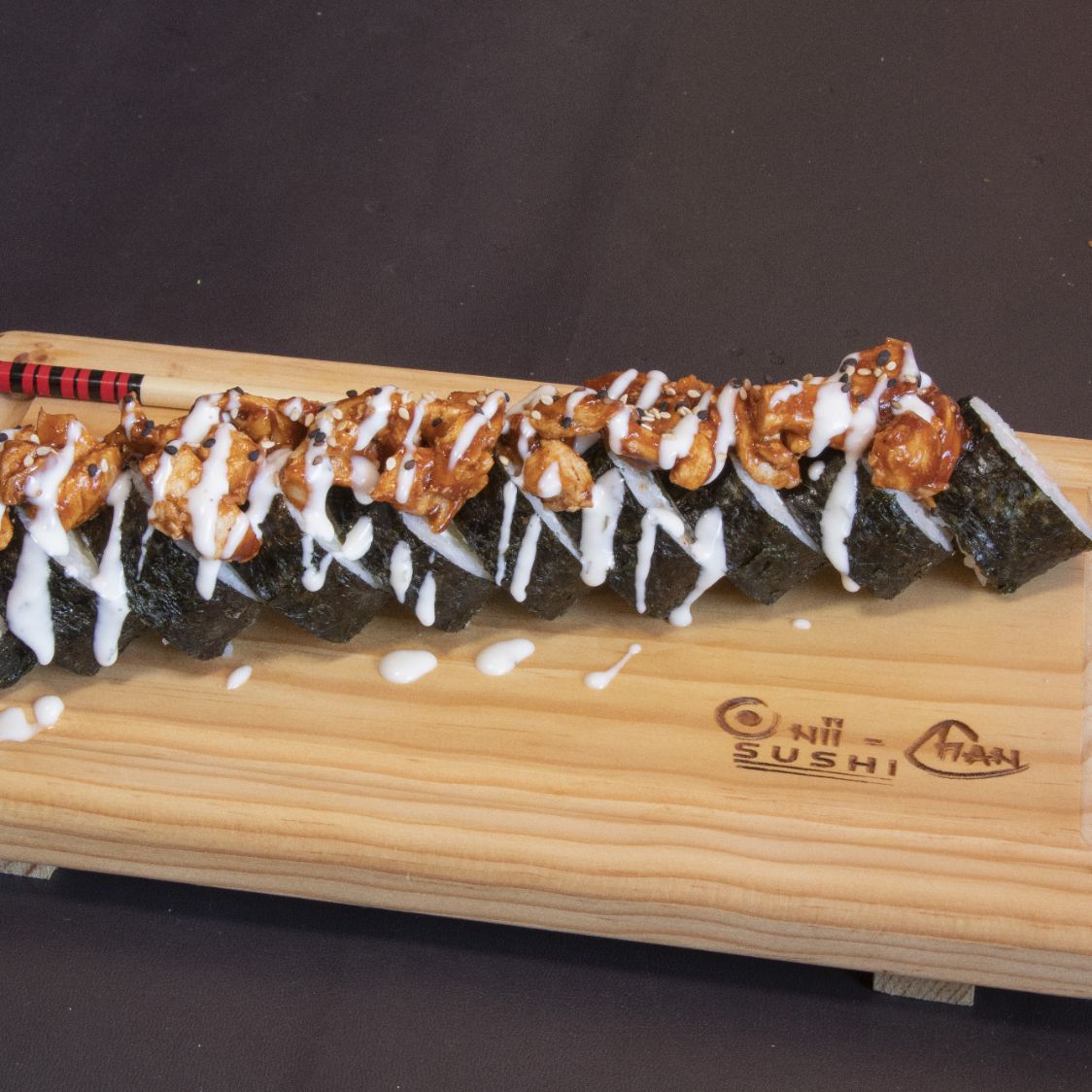 Arroz, alga por dentro, zanahoria, pepino, queso crema, coronado con pollo teriyaki y bañado con salsa teriyaki.