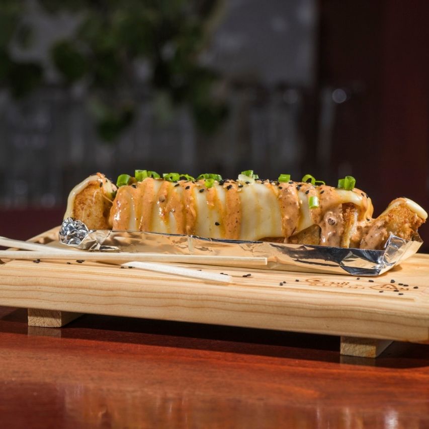Queso crema, mozzarella, camarón panko, tocino, cebolla asada, tampico, chipotle y anguila.