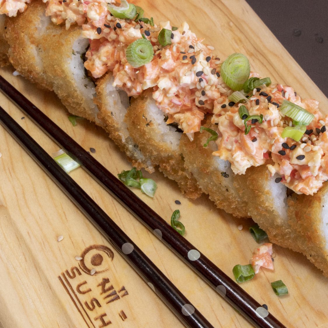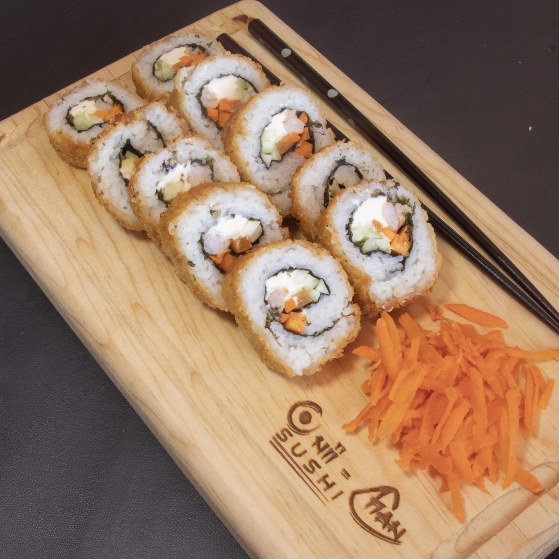 Arroz envuelto en alga, con zanahoria, pepino, queso crema, aguacate y camarón panko, coronado con cubitos de queso empanizado.