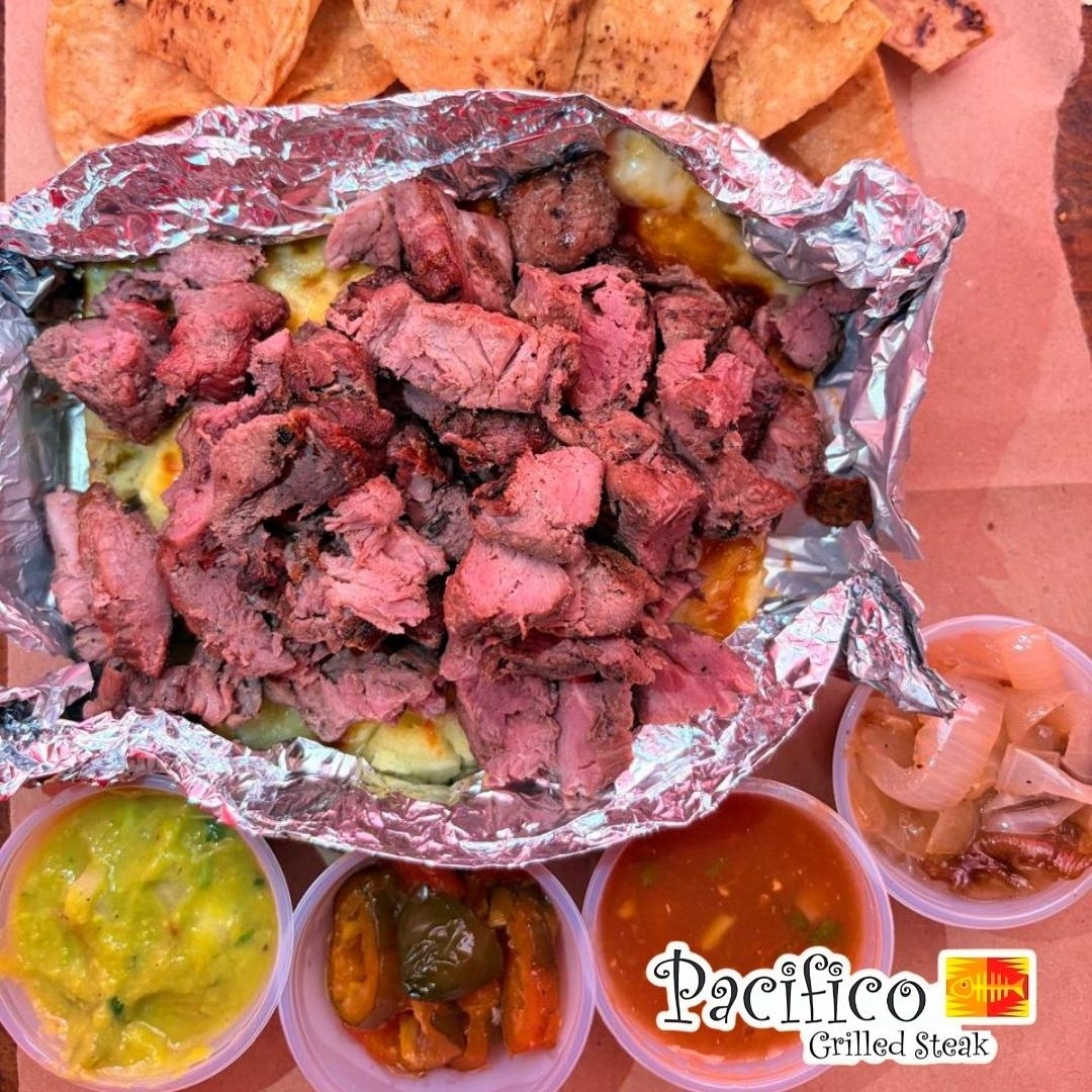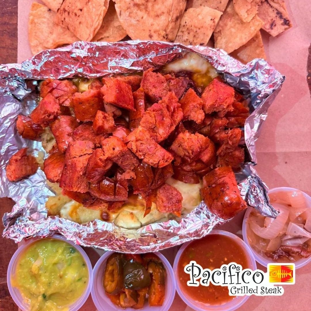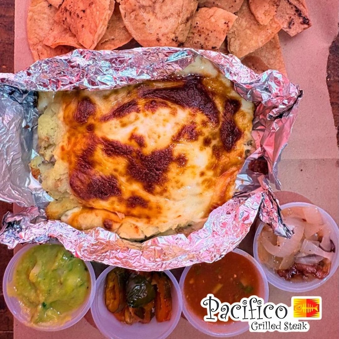 Papa rellena de carne arrachera, chorizo y queso motzarella, incluye guacamloe, cebolla caramelizada, salsa roja, chiles toreados y totopos.