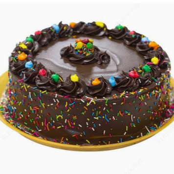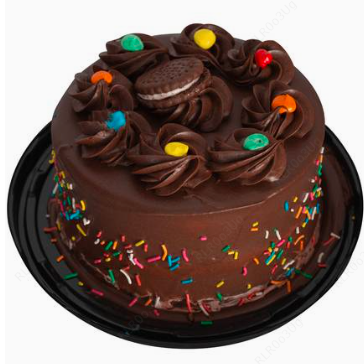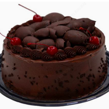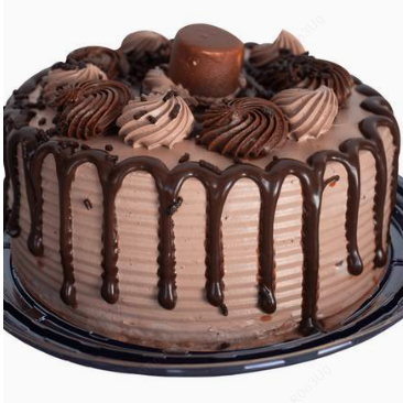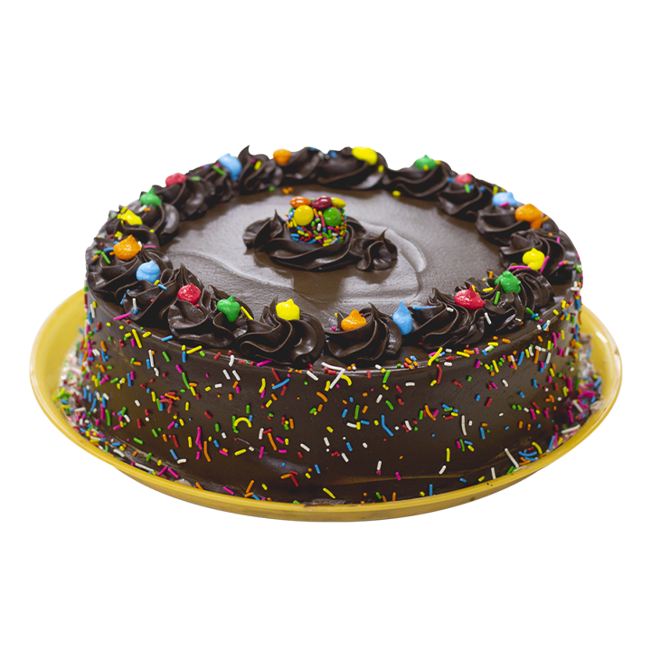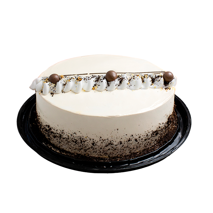 Pan de chocolate bañado en tres leches relleno de crema de chocolate y lunetas trituradas, decorado con betún de chocolate, ganache y lunetas.