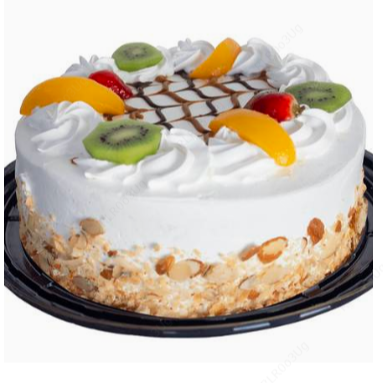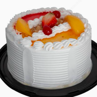 Pan de vainilla bañado en tres leches relleno de crema con coctel de frutas,cubierto de crema batida y decorado con fruta de temporada.