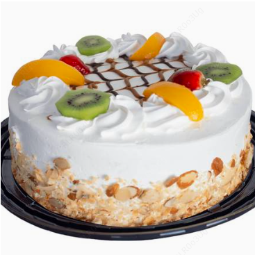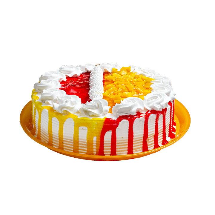 Pan de vainilla bañado en tres leches relleno de crema con cóctel de frutas, decorado con crema batida y frutas.