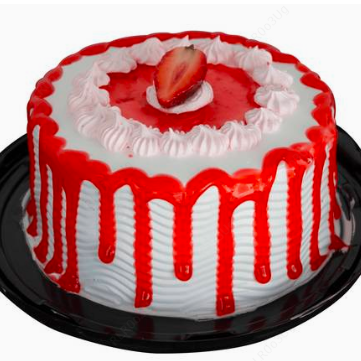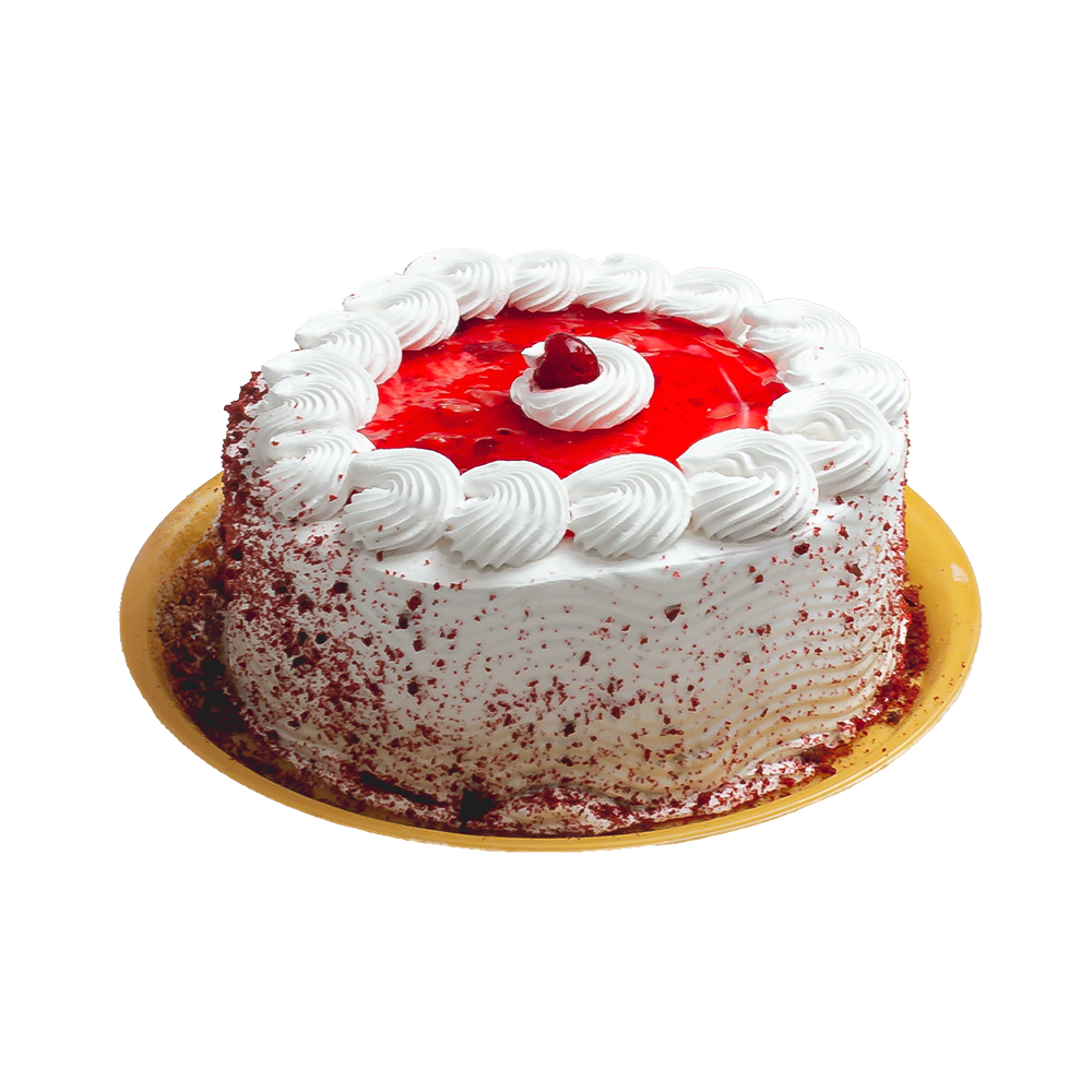 Pan de vainilla bañado en tres leches relleno con crema de queso y mermelada de fresa, decorado con crema batida y fresas.