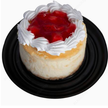 Pastel de queso con base de galleta molida decorado con fresa y crema batida.