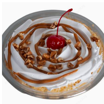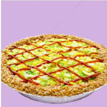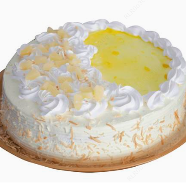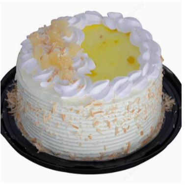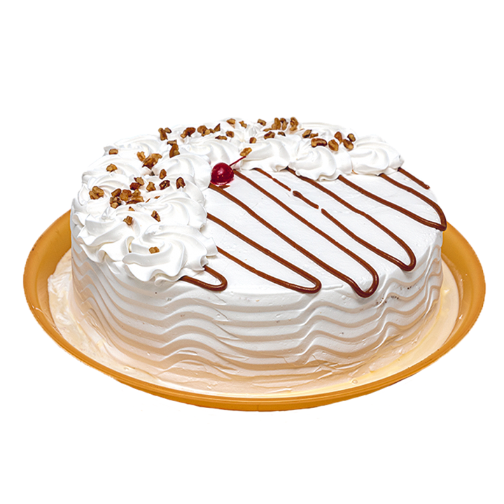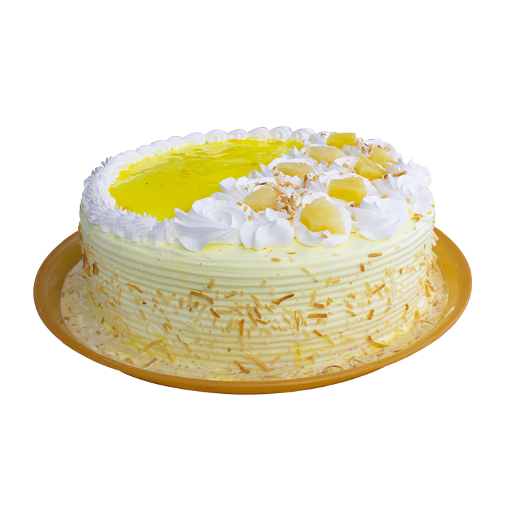 Pan de vainilla bañado en tres leches relleno de crema con piña, decorado con crema batida y coco.