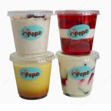 Un vaso de arroz, una gelatina de fresa, una gelatina de mosaico y un vaso de flan.