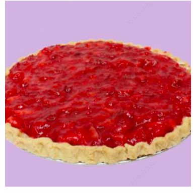 Pan de vainilla bañado en tres leches relleno de crema de queso mitad durazno y mitad fresa.