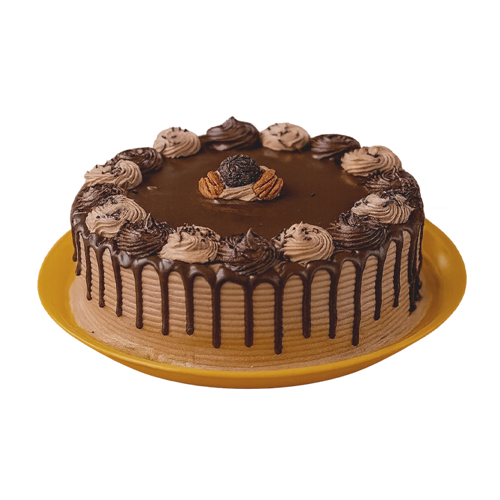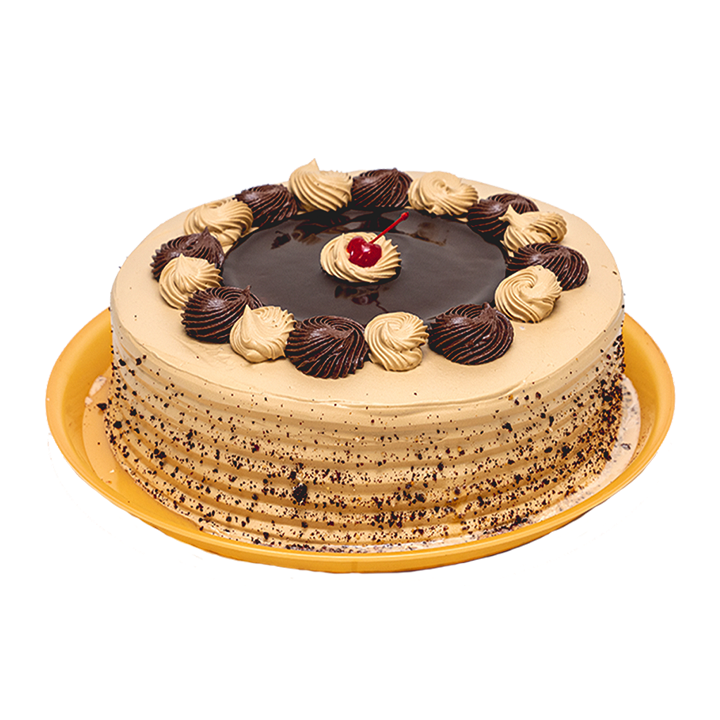 Pan de vainilla bañado en tres leches sabor café, relleno de crema de chocolate y decorado con betún de café.