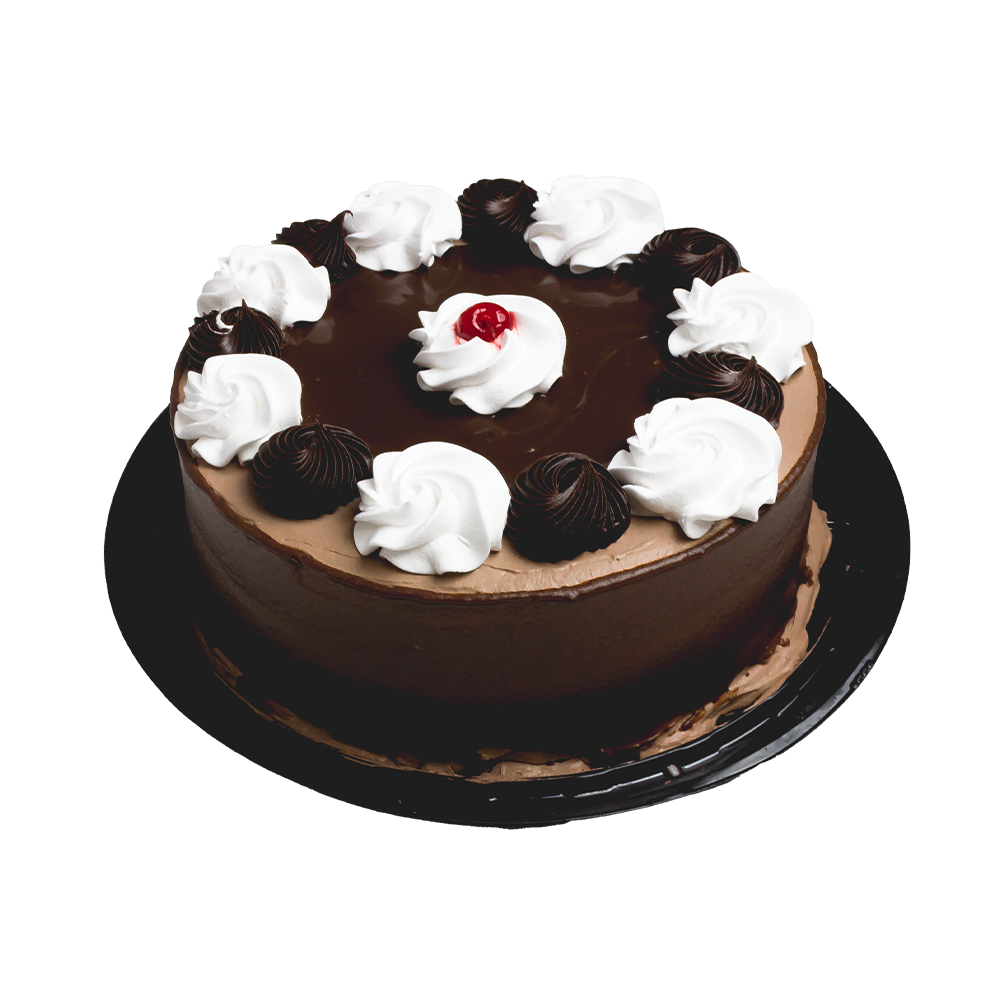 Pan de chocolate bañado en tres leches relleno de crema de chocolate con trocitos de lunetas decorado con crema batida de chocolate y cubierto con ganache de chocolate y lunetas.
