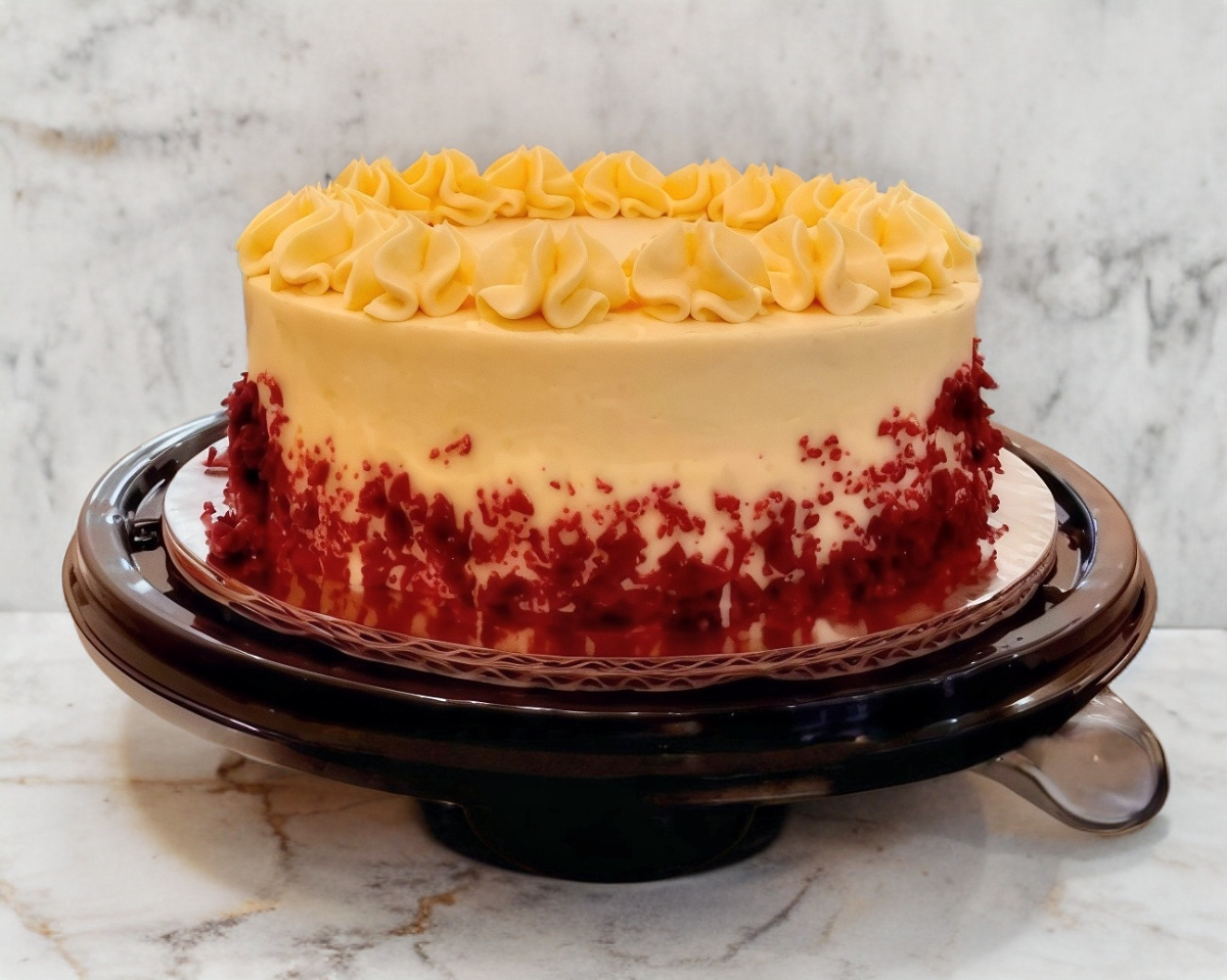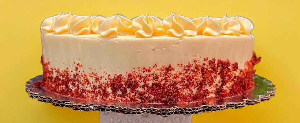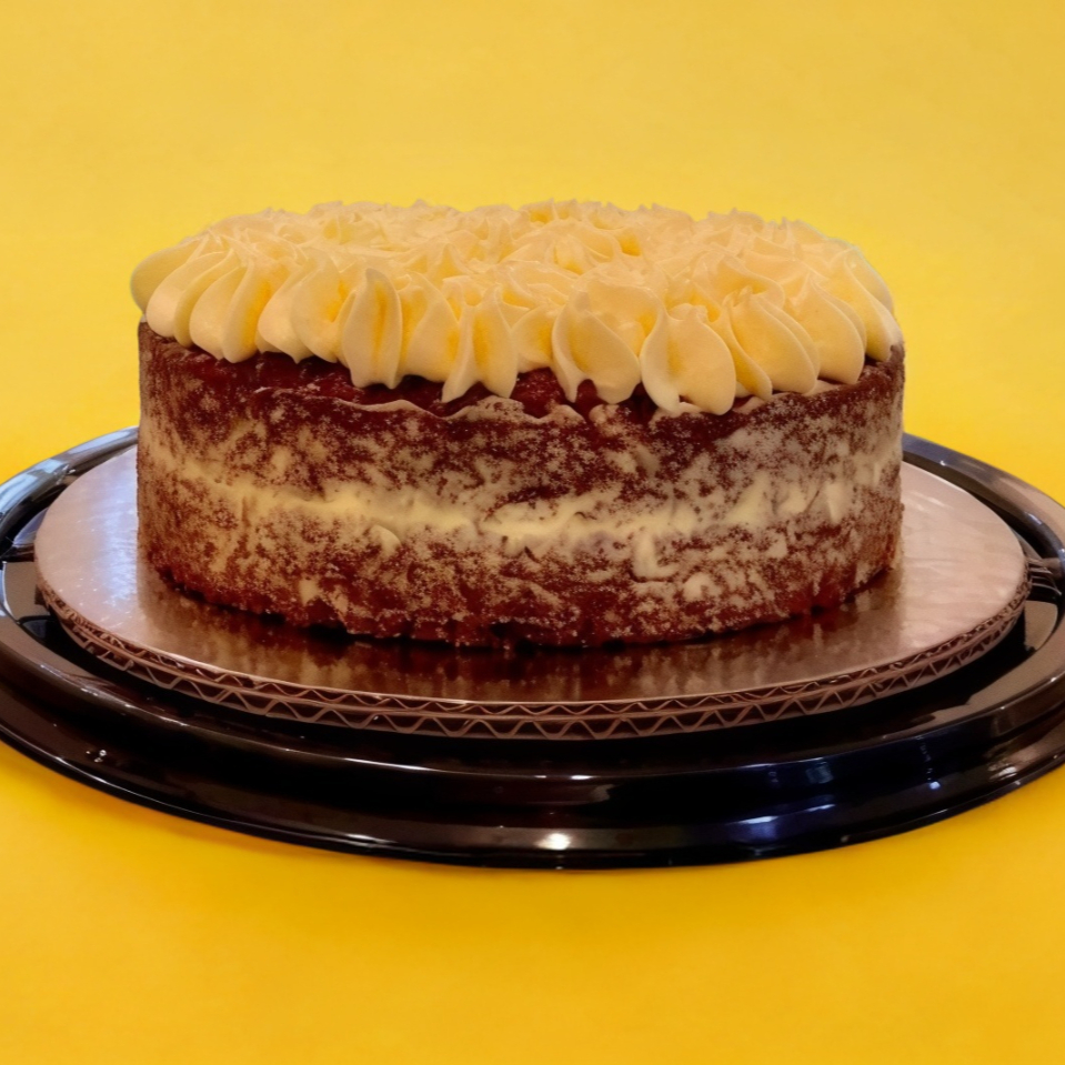 Hecho con la receta tradicional Estadounidense, delicioso pan esponjoso aterciopelado con un ligero sabor a chocolate y un betún cremoso de queso crema. 16/20 personas aprox