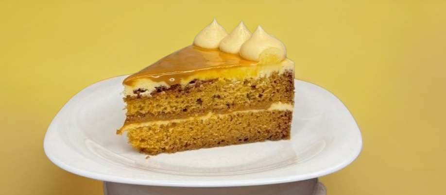 Rebanada de bizcocho de Vainilla, relleno de dulce de leche y coronado de mas dulce de leche y queso crema.