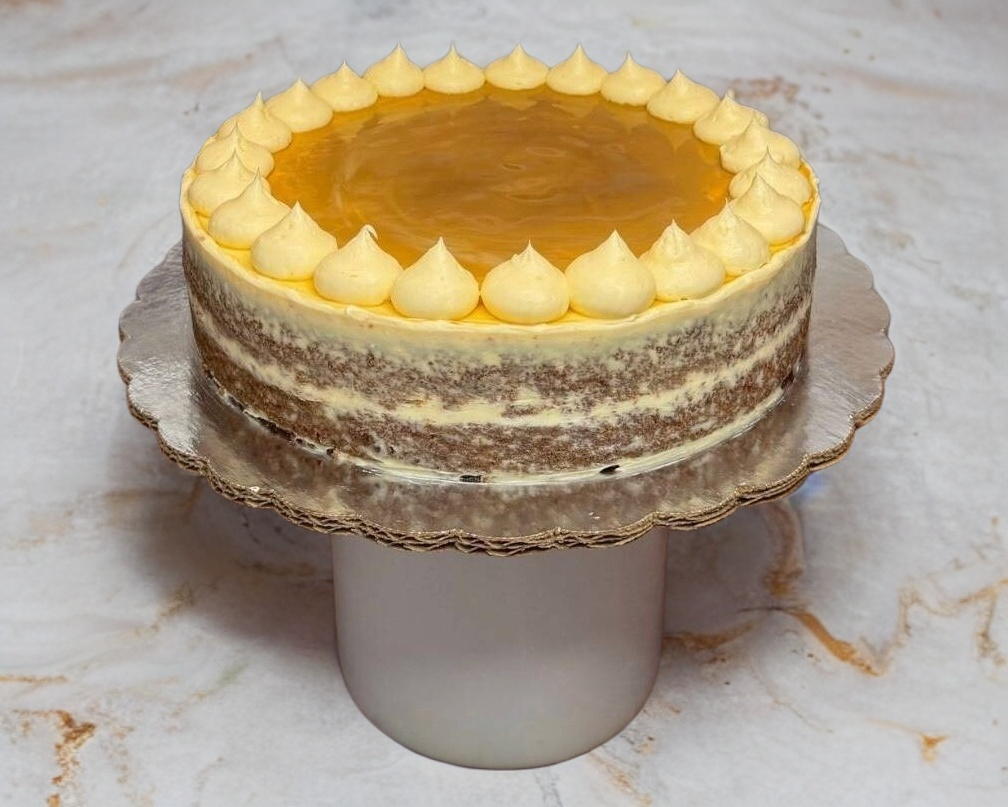 Bizcocho esponjoso de vanilla relleno de dulce de leche y coronado con MAS dulce de leche y queso crema.