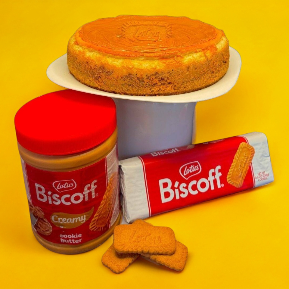 Delicioso cheesecake cremoso con base crujiente de galleta Lotus y coronado con crema Lotus