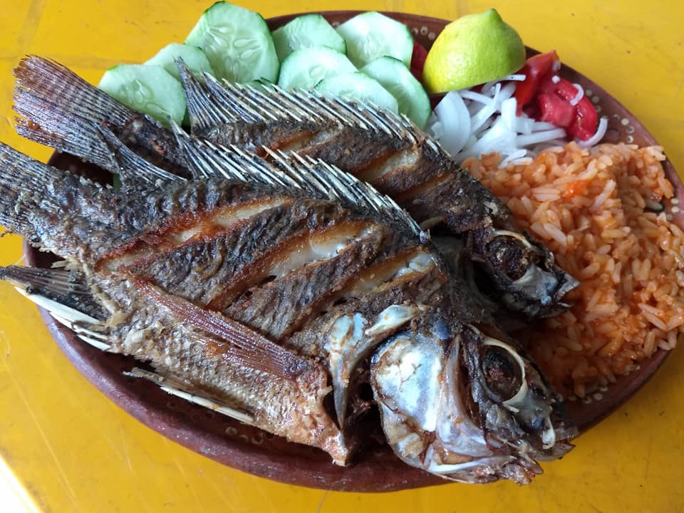 1/2 d camarónes ,verdura a media luna ,salsa ,adereso y totopos