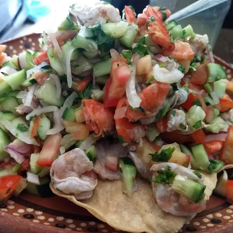1/2 kg de ceviche de camarón , totopos ,refresco d 600ml. Y salsa en aguchile