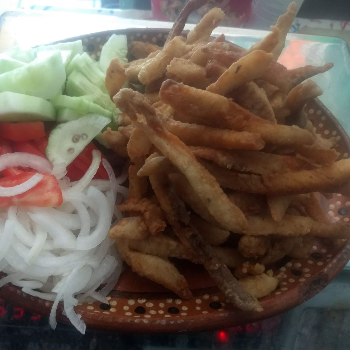 1/2 orden de chicharrón de pescado ,verdura a media luna , refresco d 600 ml ,tortillas y su salsa