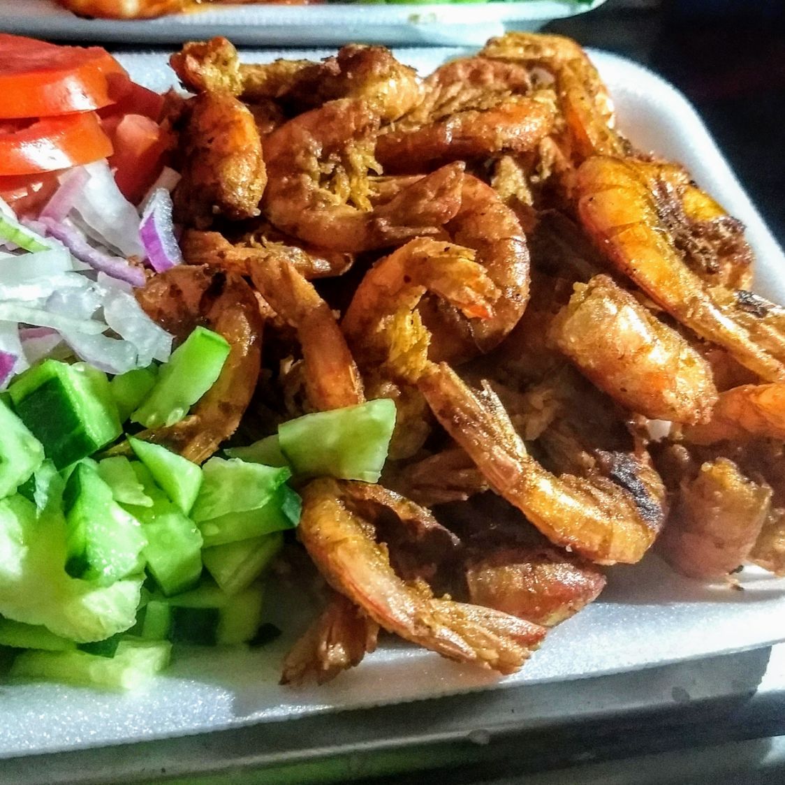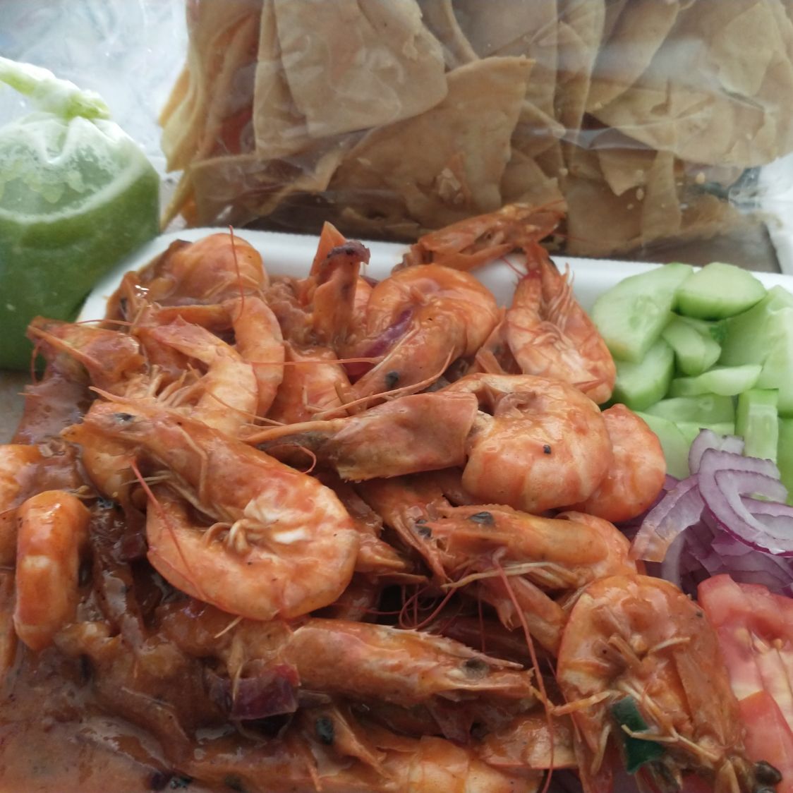 1/2 kilo de camarónes ,verdura a media luna ,tostadas y su salsa