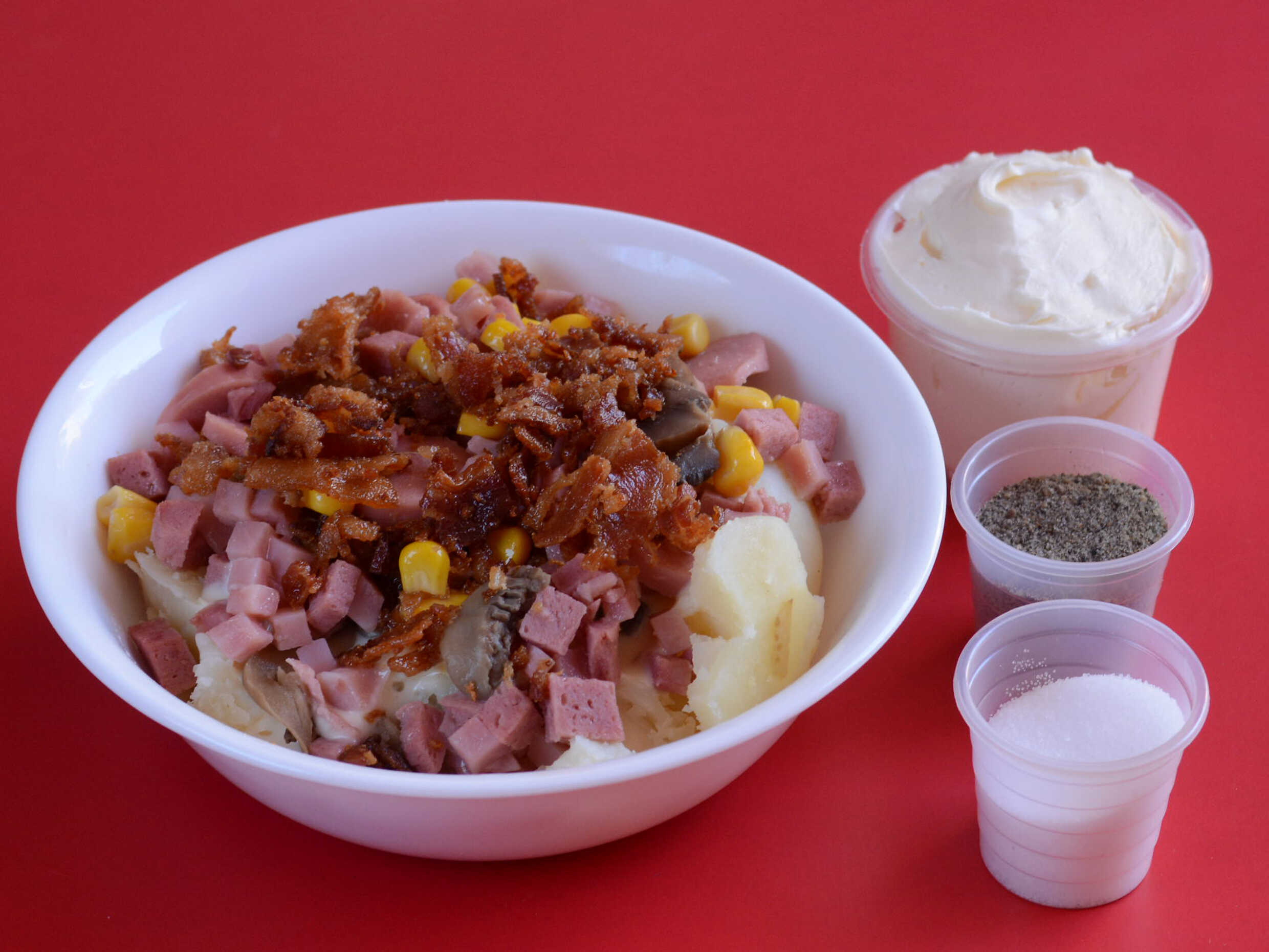 Horneada bañada en crema y un ingrediente a elegir: jamón, tocino, queso, salchicha, elote, champiñones , chorizo.