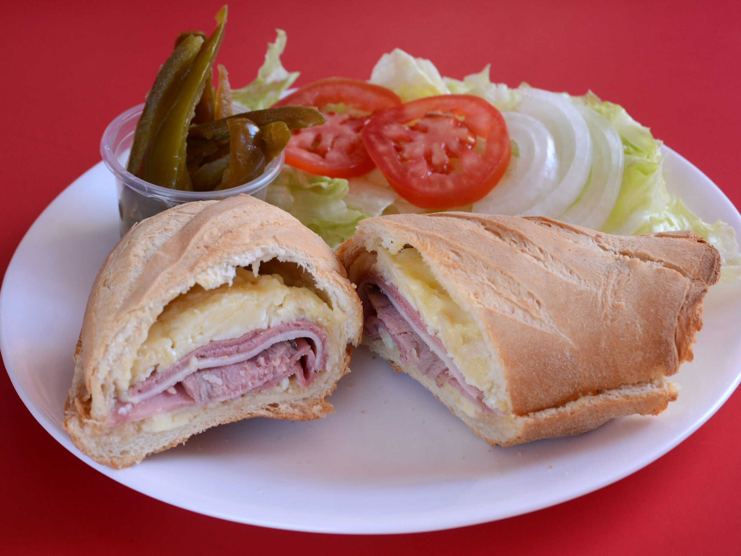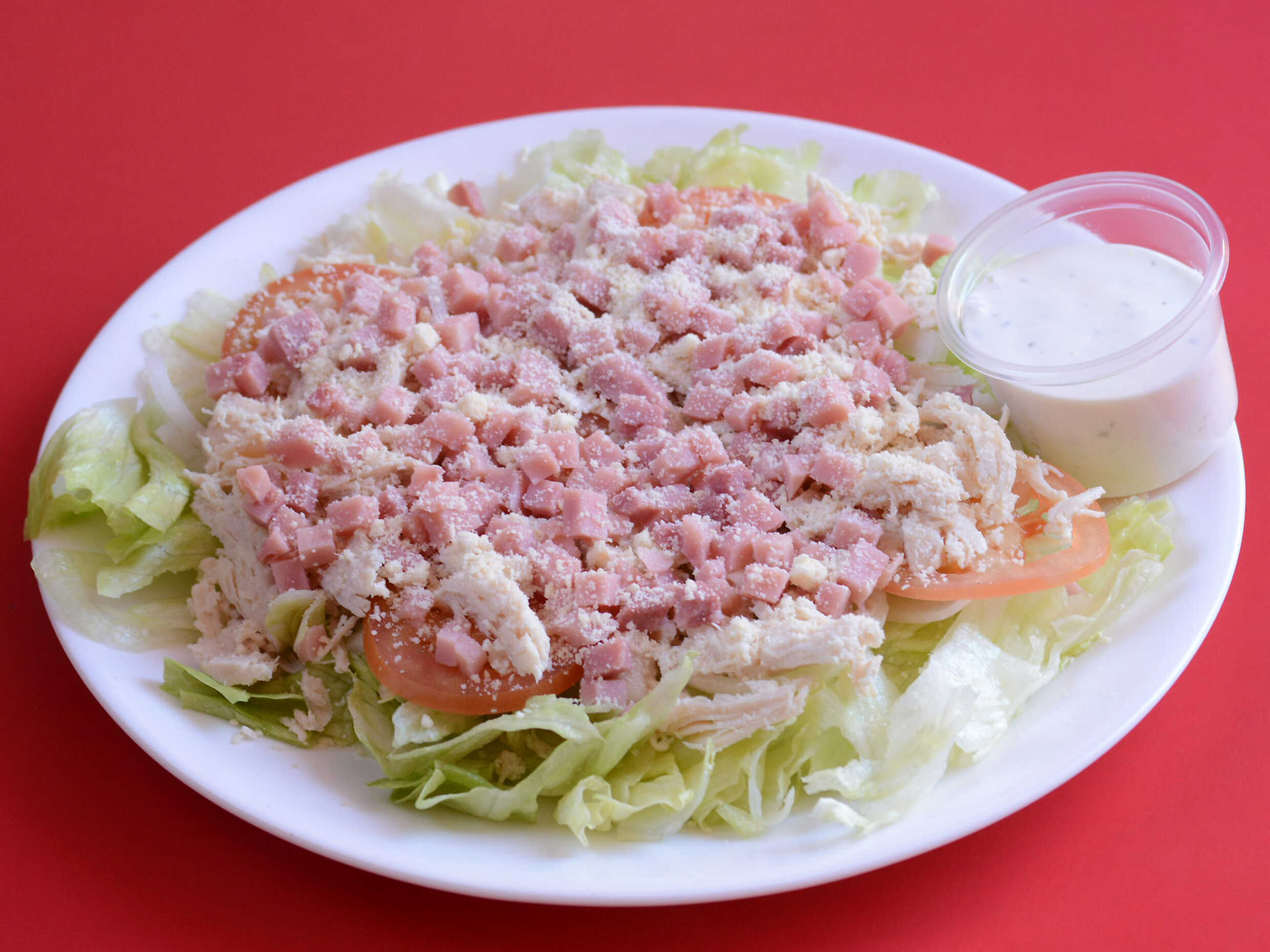 Lechuga, jitomate, cebolla, trozos de pollo, queso, jamón y aderezo
