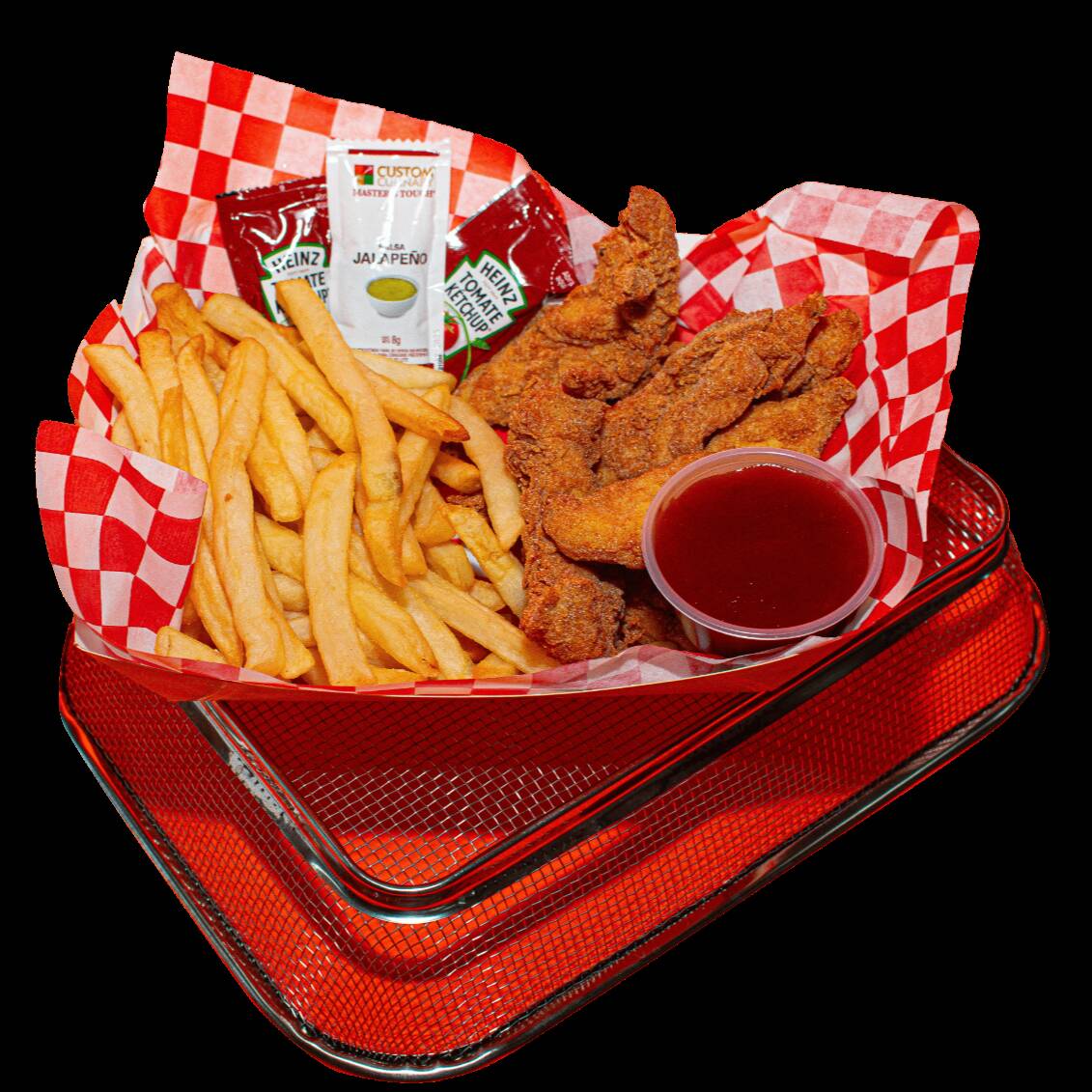 TIRAS DE POLLO (BBQ, BUFALO O NATURAL) INCLUYE PAPAS Y REFRESCO