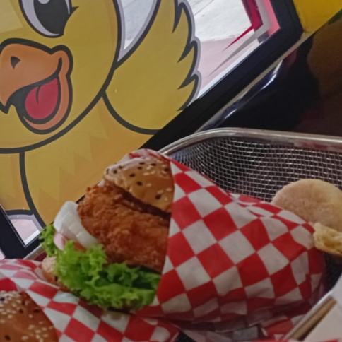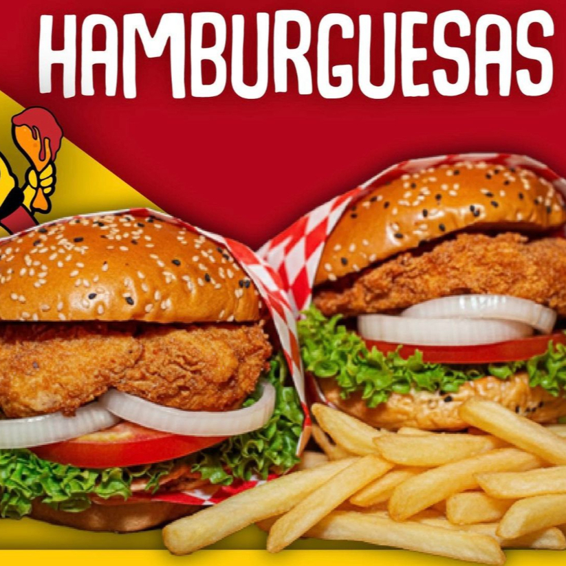Hamburguesa de pechuga frita, incluye papas y refresco