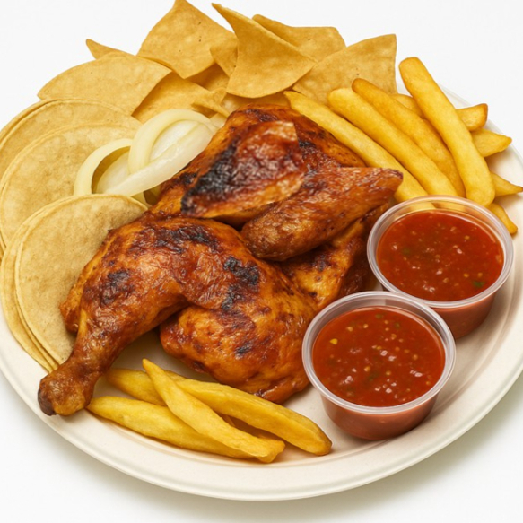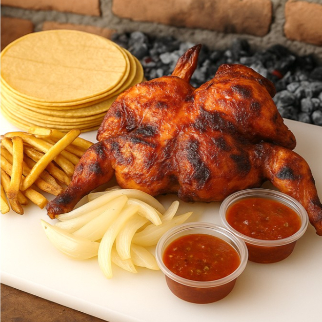 2 piezas de Pollo asado al carbón y leña, incluye: salsa suave + salsa picante + papas fritas + tortilla + cebolla asada