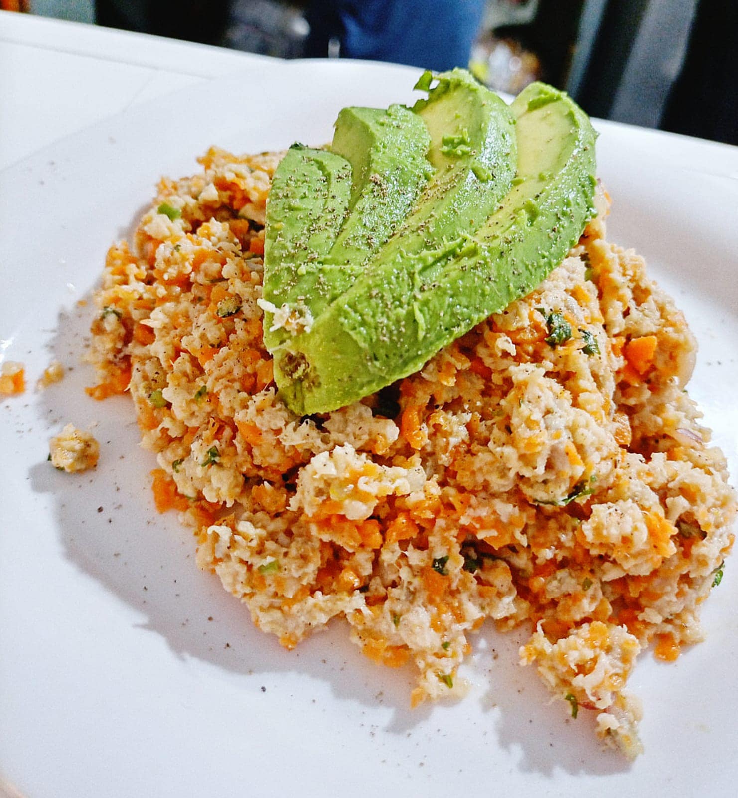 (320 gr) mezcla de camaron cocido, crudo, seco, pulpo y atun con cecina en una cama de verdura y salsa de la casa.
