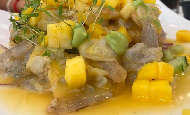 Cama de ceviche de pescado acompañada de verdura y coronado con atún bañado en salsa de chiltepin