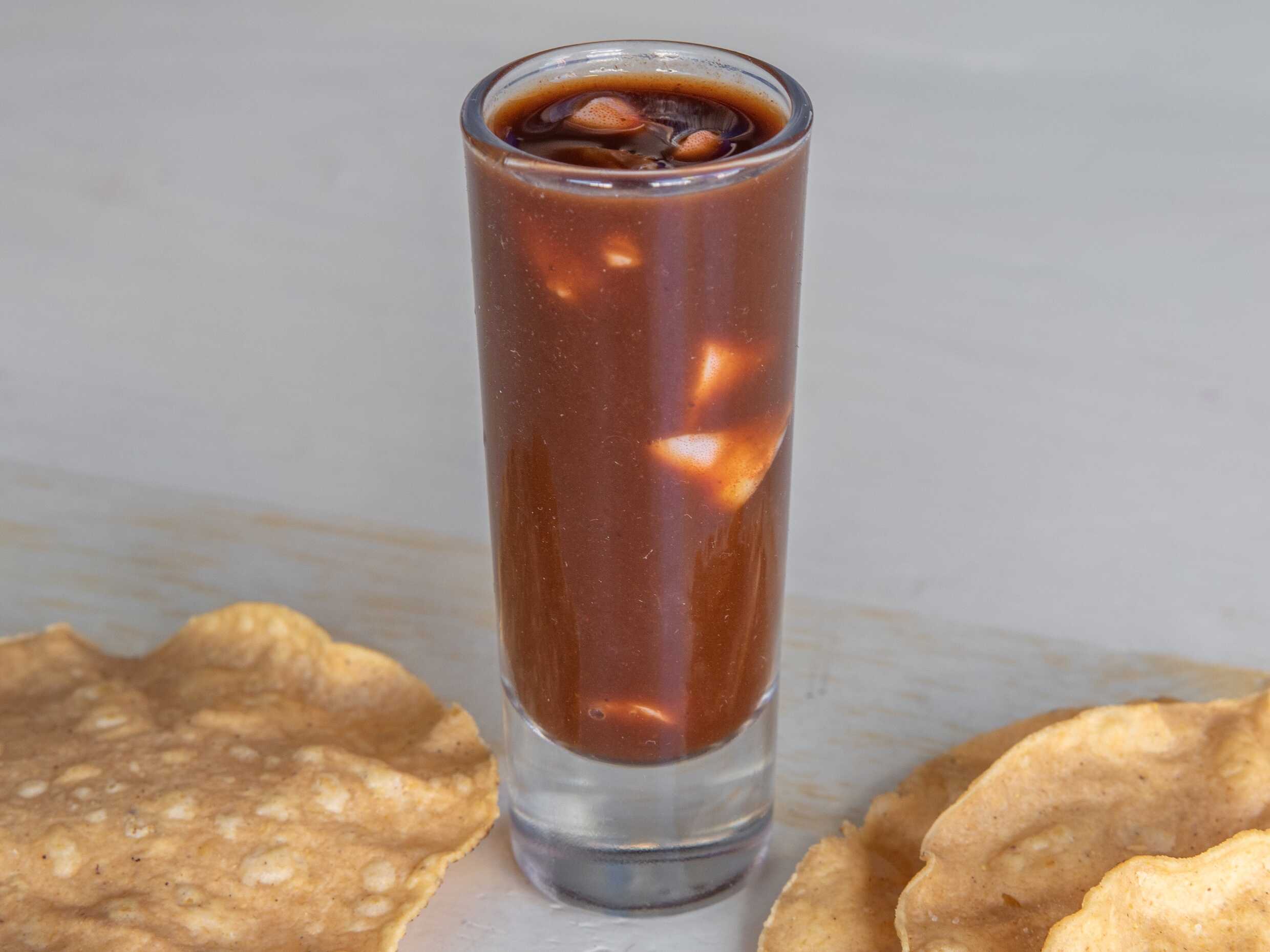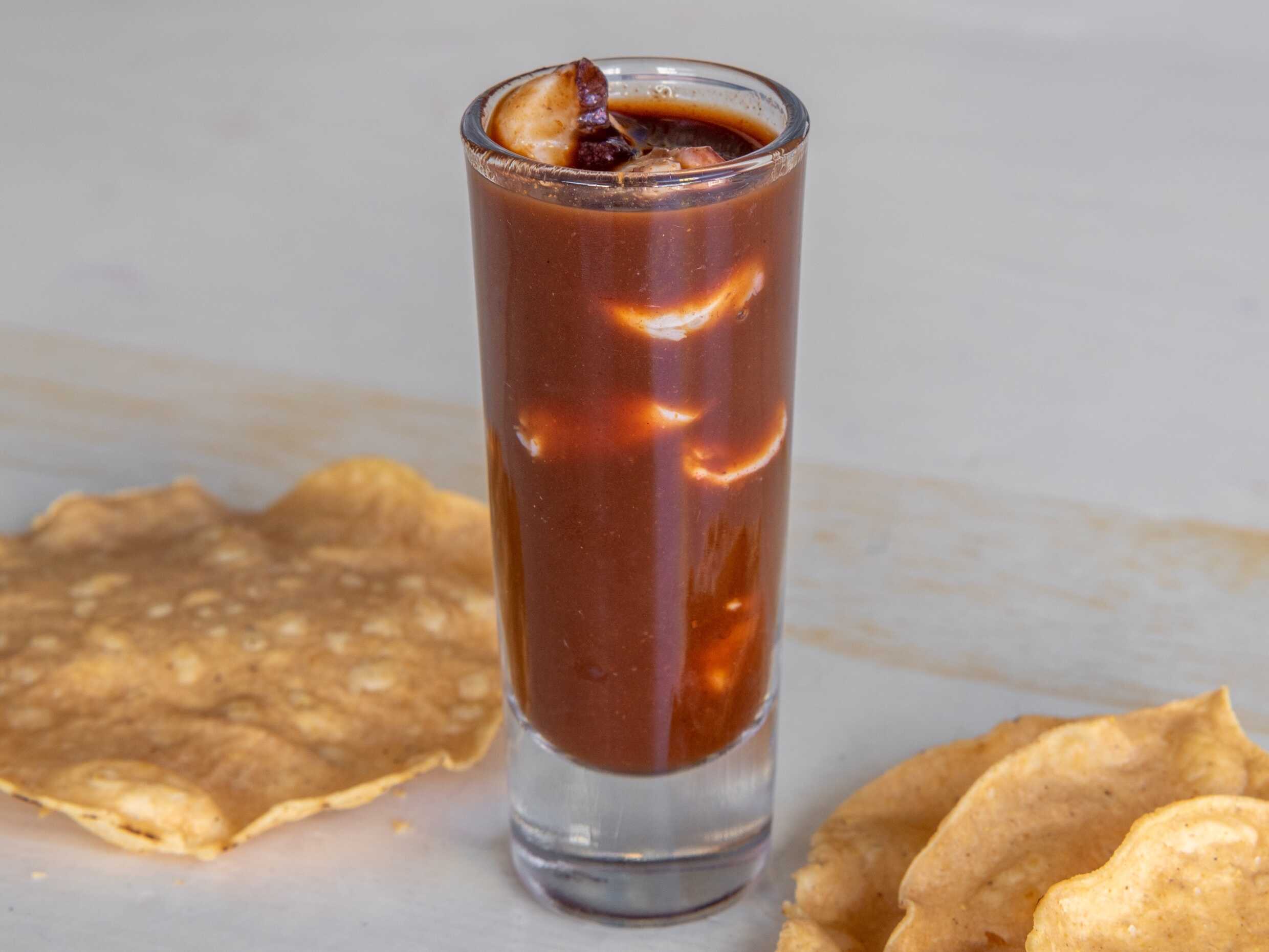 Clamato Salseadocon camarón crudo,cocido,pulpo y callo perla , acompañado de pepino y cebolla