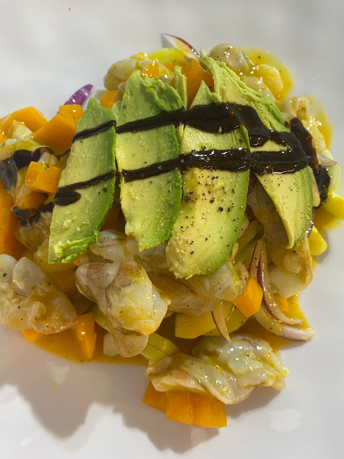 (300 gr) camaron curtido en salsa de mango acompañado de verduras con trozitos de mango.