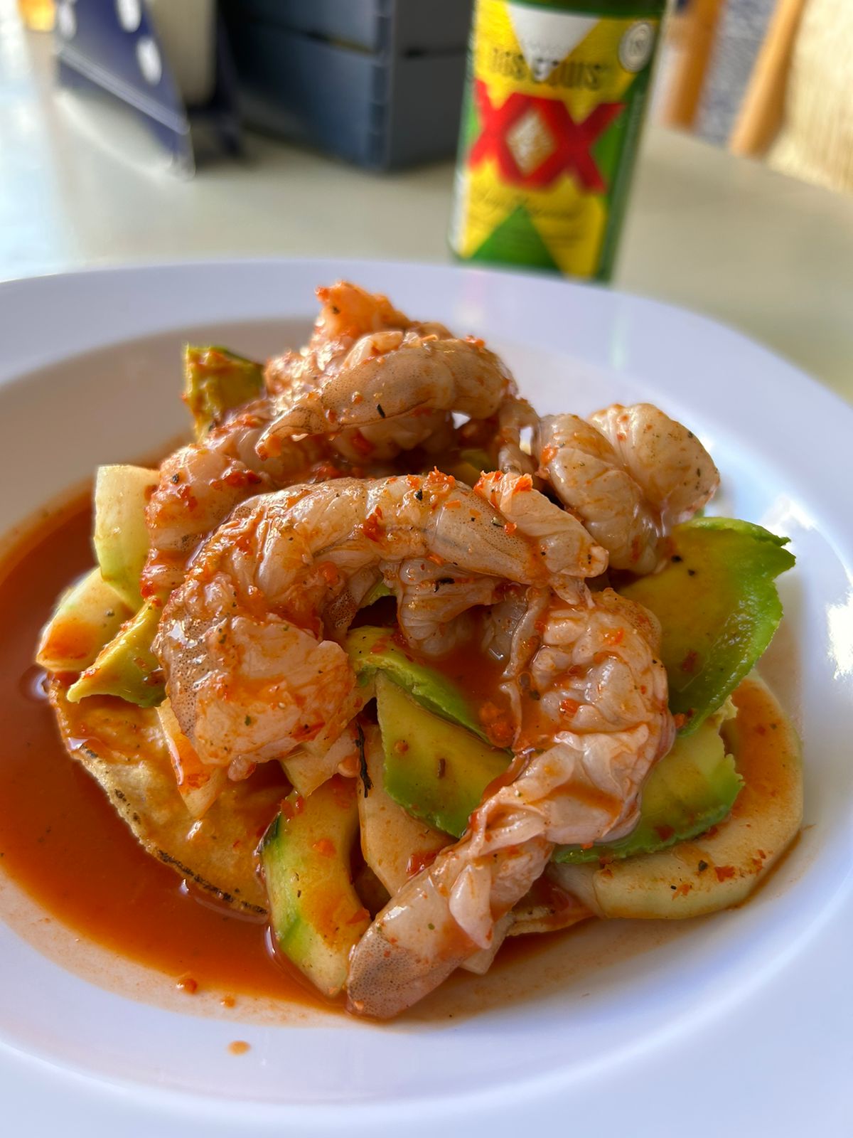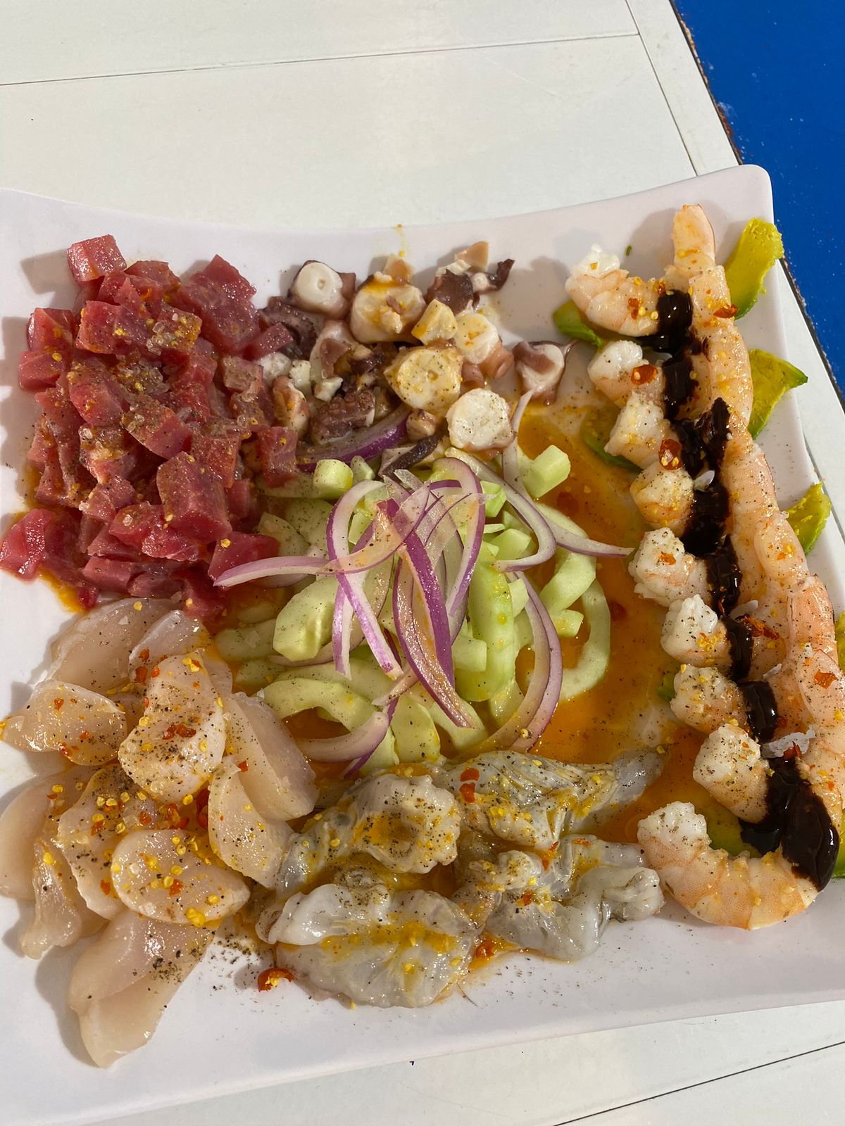 Especial de la casa, camarón cocido, camarón crudo, camarón seco, pulpo y atun bañado en chiltepin