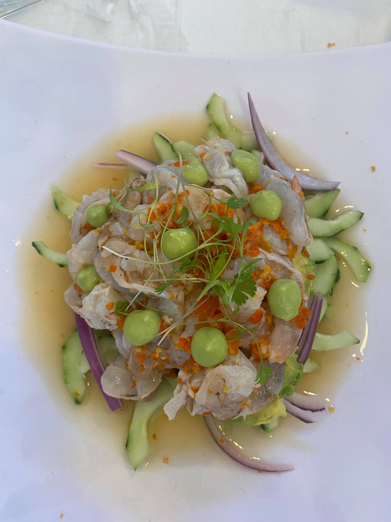 Cama de ceviche de pescado, acompañado de camarón cocido,crudo y seco sobre una cama de verdura